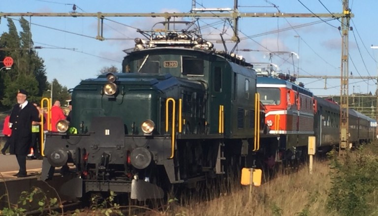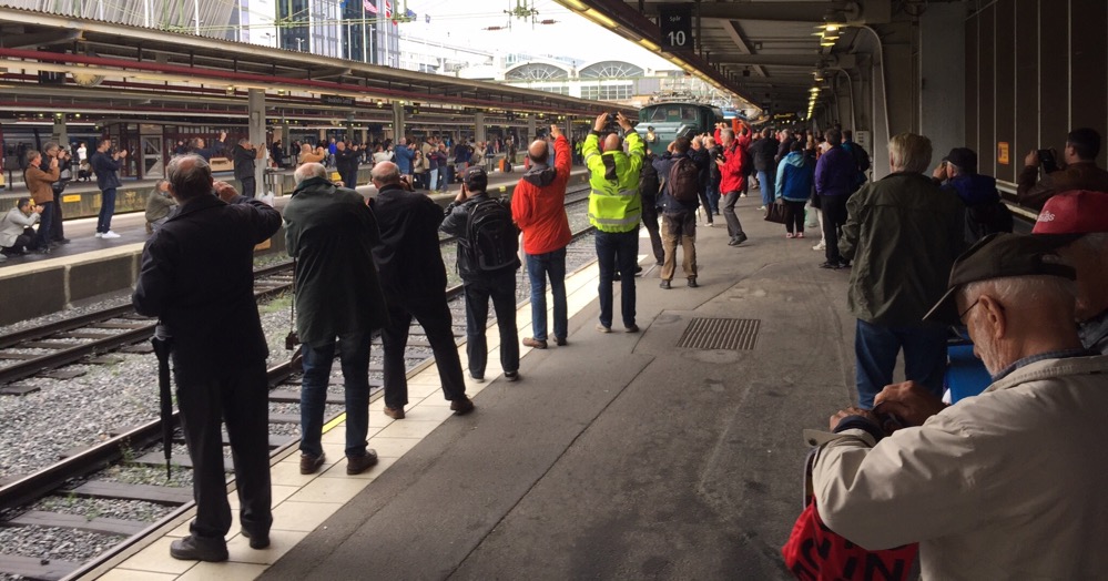 Ich brauche ein paar Sekunden bis ich aus den Gesprächen entnehmen kann, dass alle freudig erregt auf das Krokodil warten. Dieser Hype ist kaum zu begreifen! Wie ist es möglich, dass an einem normalen Dienstag Mittag um 13 Uhr so viele Hunderte SchwedInnen, Familien mit Kindern, ältere und jüngere Semester auf eine 90-jährige Elektrolokomotive aus der fernen Schweiz warten?!
