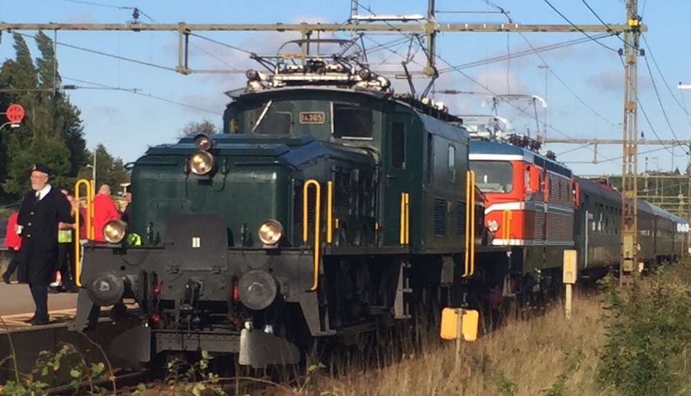 Kurz darauf in Norrköping wird unser Zug von mehreren hundert Menschen erwartet, die während der Einfahrt neben her rennen, um ja den mühsam hergestellten Kontakt zum Krokodil nicht zu verlieren. Aufgrund der Länge unseres Zugs, müssen die beiden Lokomotiven, an der Spitze unser Krokodil Ce 6/8 14305 und als Unterstützerin die schwedische Rc1 1007, über das Ausfahrsignal hinaus in die Dunkelheit fahren. Die Fans rennen mit und schiessen ihre Fotos in absoluter Dunkelheit, überwältigende Situationen!