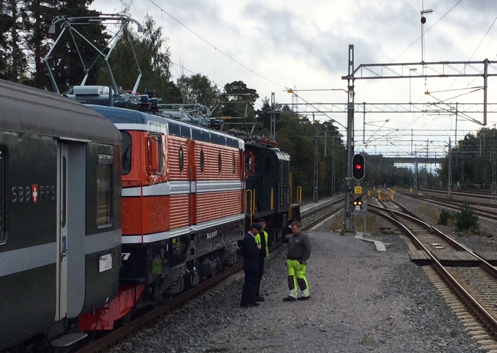 In Södertälje Hamn wird unsere Reise jäh unterbrochen. Einem Fahrdienstleiter der um 14 Uhr seinen Dienst angetreten hat, fehlt ein Stempel auf unserer Extrazugsanordnung. Die Originalanordnung wurde offenbar vom Fahrdienstleiter, der Dienstschluss hatte mitgenommen. Also müssen wir über eine Stunde lang warten, bevor wir endlich weiterfahren können.