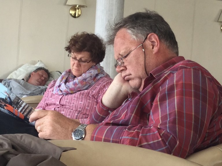 Wir sitzen unterdessen im Salon auf Deck 5, diskutieren, spielen Karten und-oder erholen uns