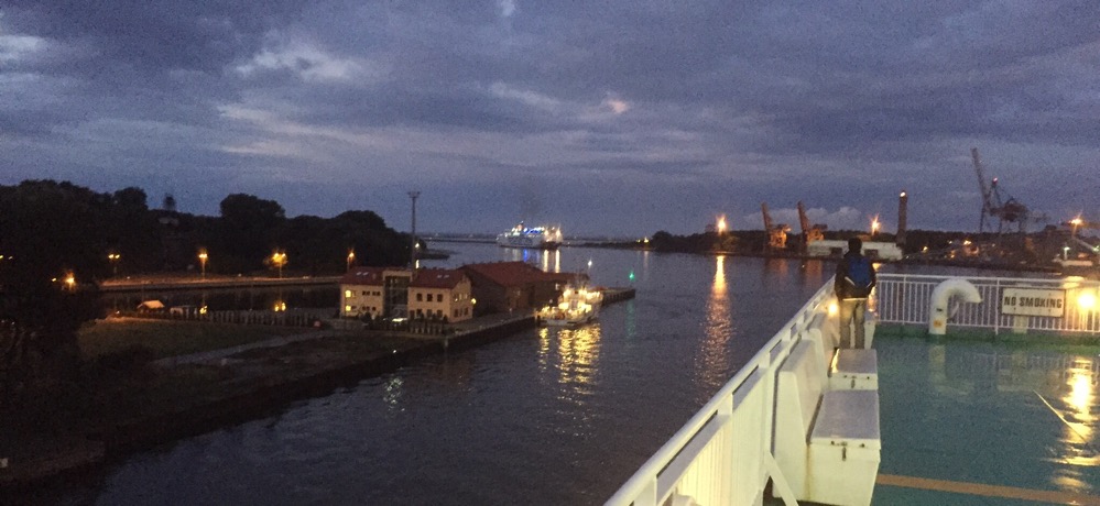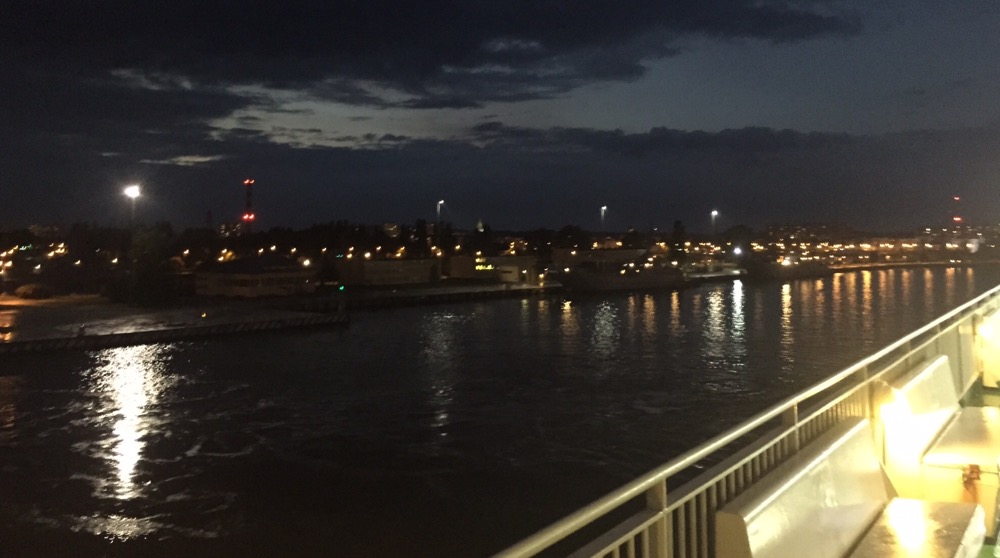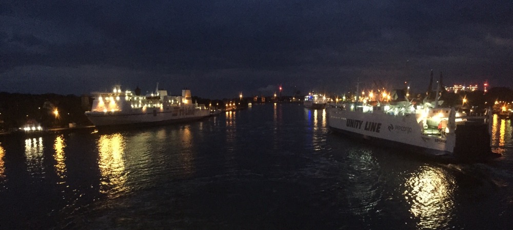 Mit der Fähre um 23.40 fahren wir zurück zum Bahnhof. Fast gleichzeitig fährt die Cargofähre in die Swina und den Hafen ein und wird am Eisenbahnterminal vertäut. Nun heisst es neuerdings warten.