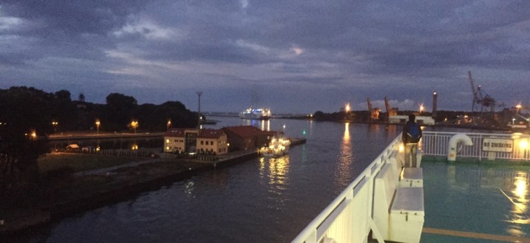 Das Schiff braucht geraume Zeit bis es an seinem Liegeplatz liegt und wir über endlos scheinende Gangways ins Hafenterminal laufen können.