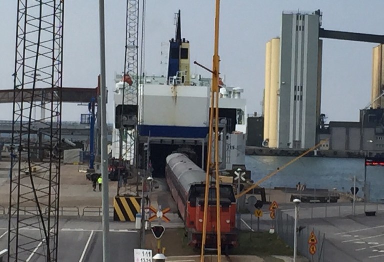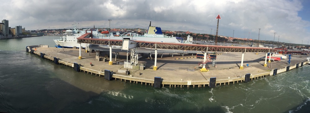 Um 10.45 fährt die Cargofähre ein. Ein einzelner 4-achsiger Güterwagen wird entladen. Die sprichwörtliche Unzuverlässlichkeit der Polnischen Cargoleute und deren immer noch staatlich kompliziertes Geschäftsgebahren haben das Geschäft auf dieser Achse total kaputt gemacht. Trotz grosser Umwege und viel höheren Gebühren rollt der meiste Güterverkehr heutzutage über westliche Fährrouten, sowie über Brücken und Tunnels von und nach Schweden.