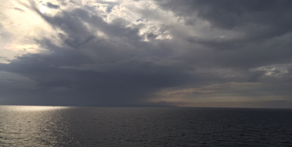 Kaum losgefahren, kühlt der Wind, dräuen dunkle Wolken am Himmel und alsbald peitscht Regen übers Deck.