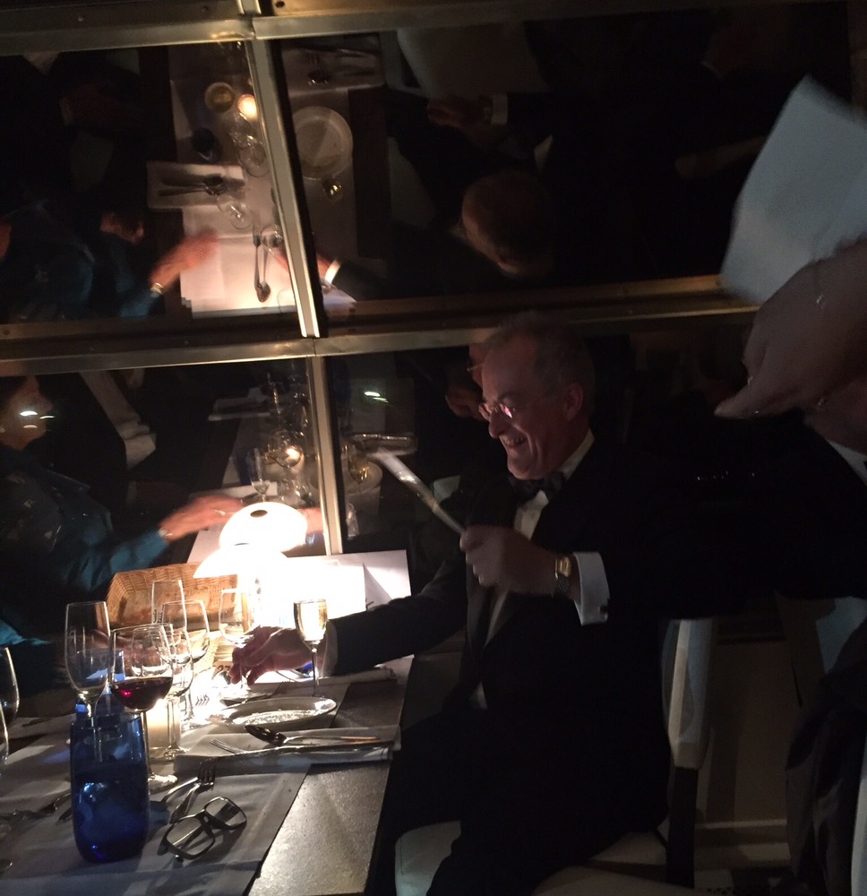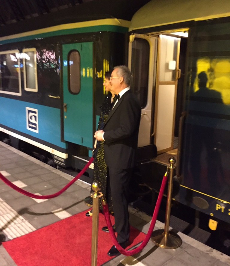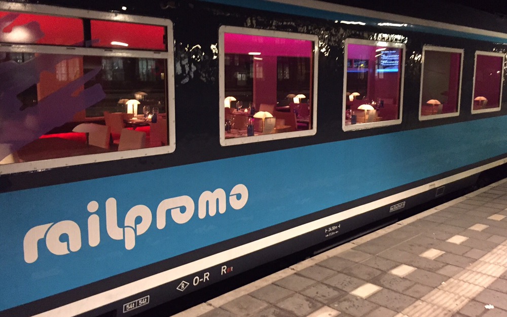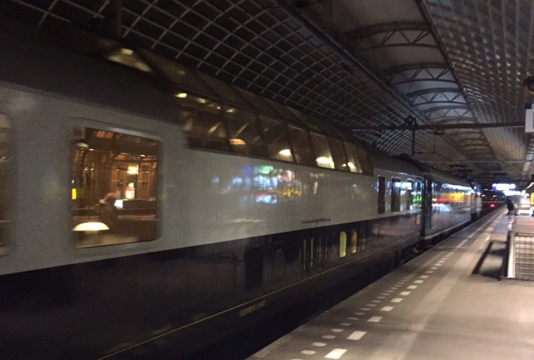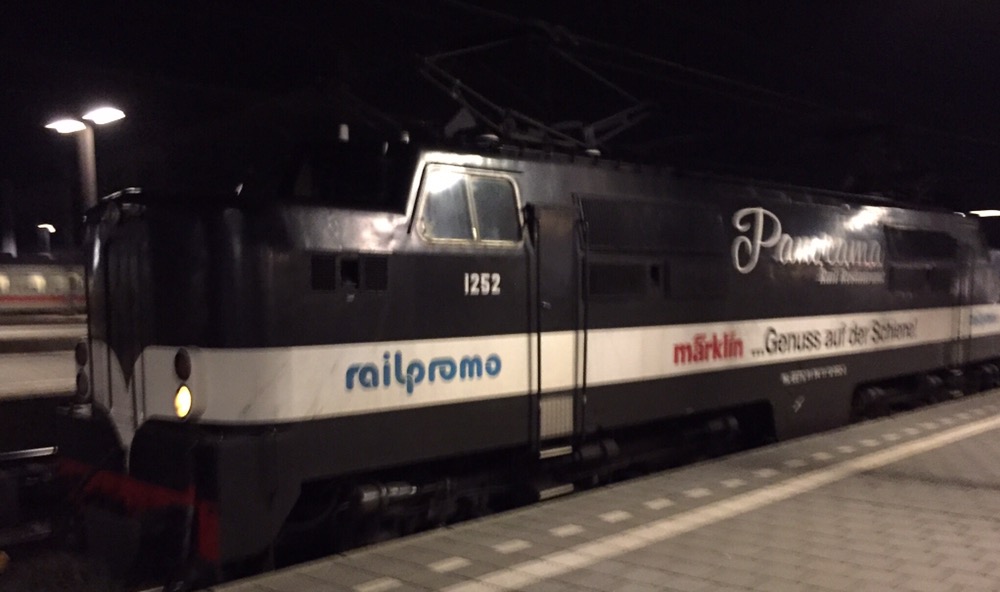Aussichtskanzel des Rheingoldwagens. Schon bald wird der erste Gang des Abendmenüs serviert, während ich mich mit meinem Gegenüber intensiv unterhalte und der Zug ruhig durch das nächtliche Holland gleitet.