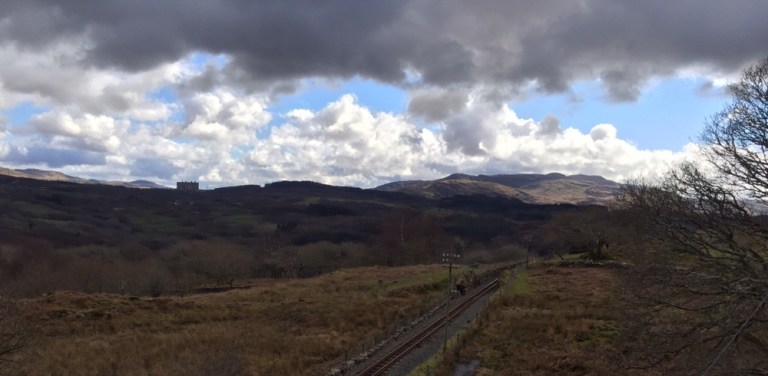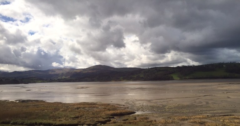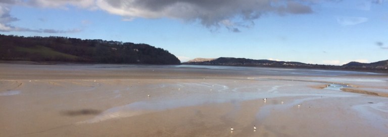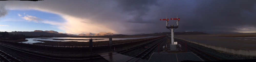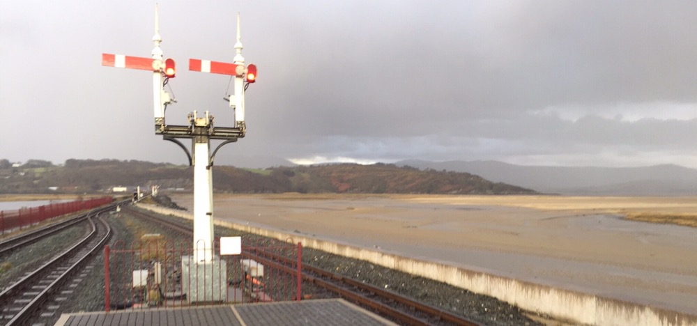 Noch herrscht Ebbe, mit Zugvögeln bedeckte Schlickbänke sind zu sehen. Als Sicherheitssystem für diese eingleisige Strecke gibt es noch immer das ursprüngliche System von zwischen Lokführern und Stellwerkmitarbeitern auszutauschenden Token (https://de.m.wikipedia.org/wiki/Conwy_Valley_Line).