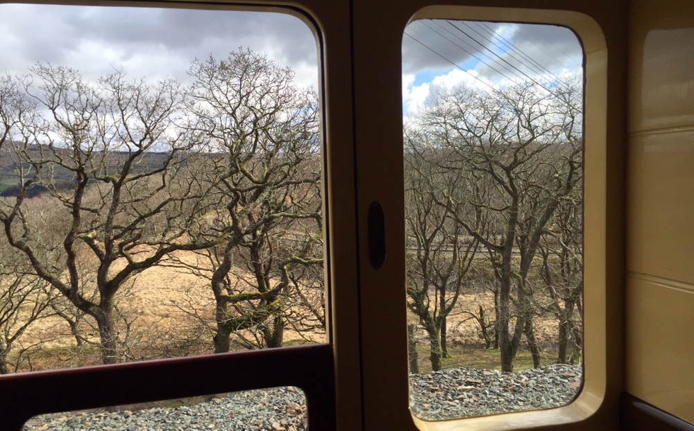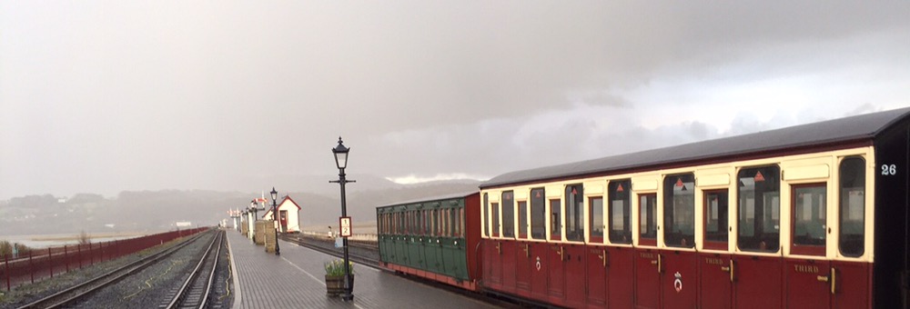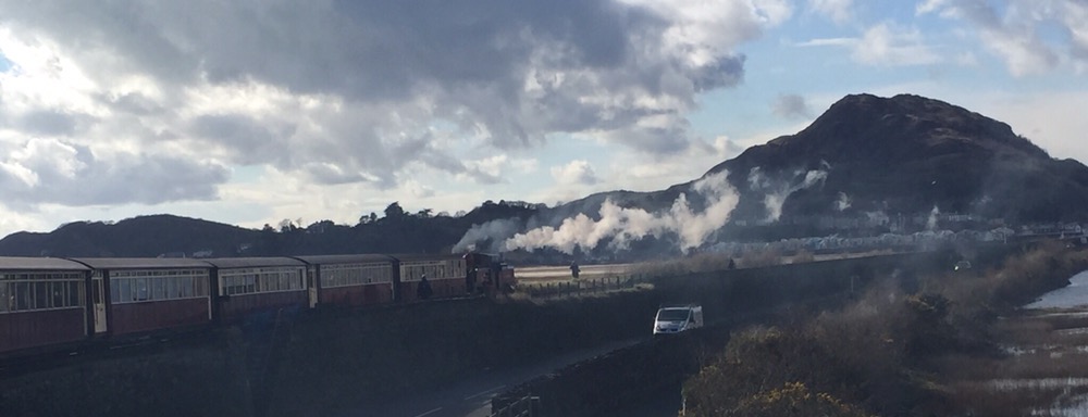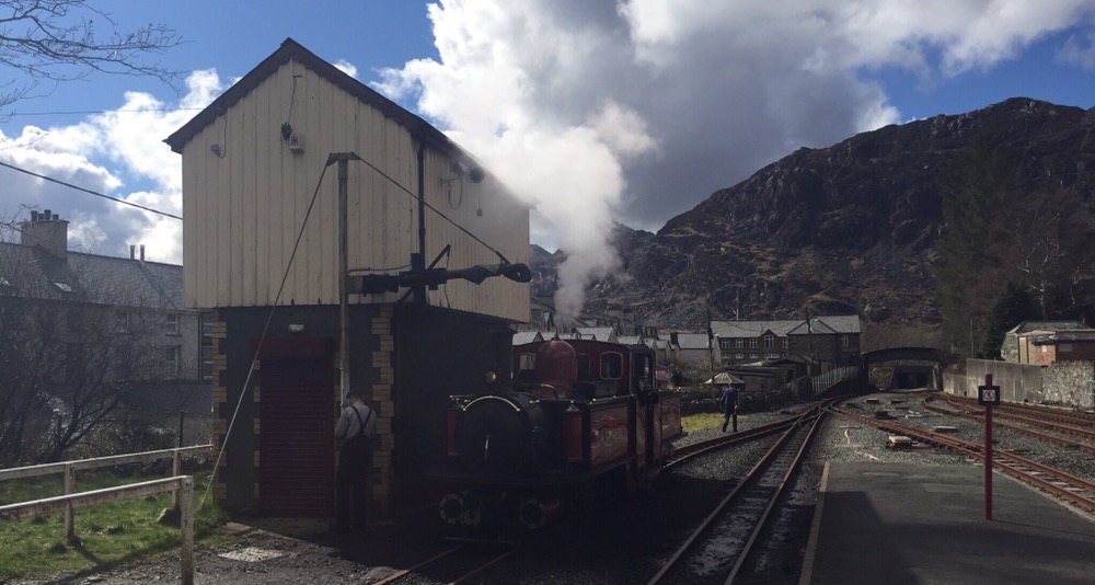Also fahre ich mit dem aus ca 15 Wagen bestehenden 15.05 Zug der Ffestiniog Eisenbahn (http://www.festrail.co.uk), der von einer Fairlie Dampflokomotive gezogen wird. Im Prinzip sind dies 2, Hinterteil an Hinterteil gebaute Lokomotiven, https://de.m.wikipedia.org/wiki/Fairlie_(Lokomotive)