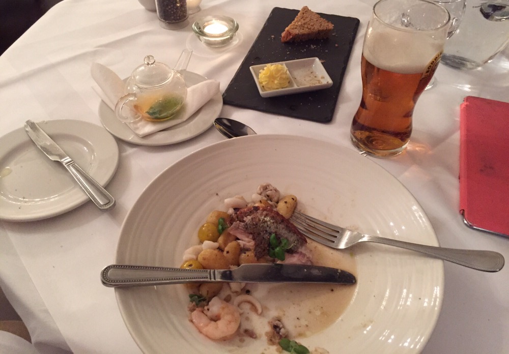 Alle Beizen voll, also esse ich mal wiederum Hotel. Aber halt, einfach so in den Speisesaal (obwohl bis auf einen Tisch komplett leer) zu gehen ist nicht erlaubt. im Salon kriege ich die Karte in die Finger gedrückt, verbunden mit der Frage was für einen Apperitiv ich den zu mir nähme. Als dies erledigt ist und ich meine Speisen, Salat und hinterher Fisch auf Meeresfrüchtengnocchi bestellt habe, werde ich in den Speisesaal gebeten.