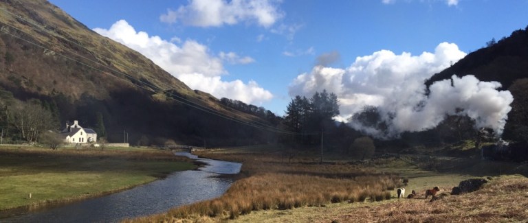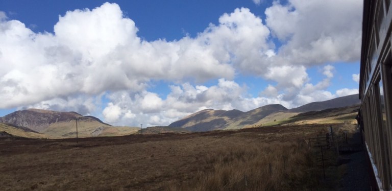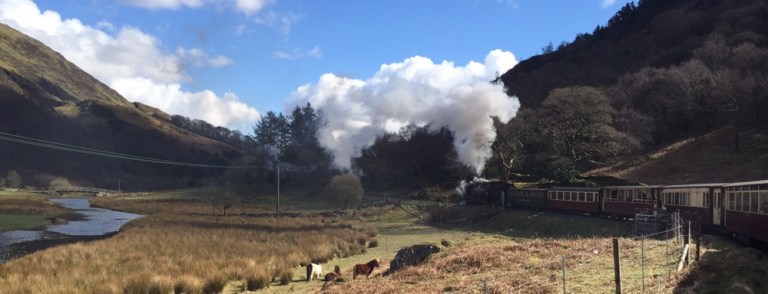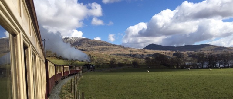 vorbei an einsamen Bauerngehöften und tausenden von überwachten und gehüteten Schafen. Schon gestern sind mir etliche Schafe aufgefallen, die bis zu 4 Lämmer hatten. Heute wird mir nun von einer walisischen Mitreisenden erzählt, dieses Jahr seien es besonders viele Vierlingsgeburten, man wisse nicht warum. Bald fährt der Zug in ein Tal ein. nun steigt die Strecke an. Mehrere Serpentinen sind zu bewältigen, die Dampflok schnauft schwer.