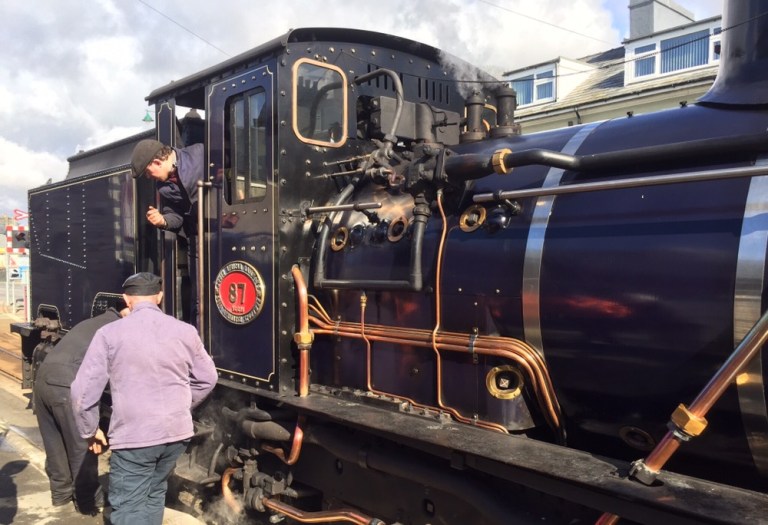 Laut vor sich hinstampfend steht ‚unsere‘ Garrat, https://de.m.wikipedia.org/wiki/Garratt_(Lokomotive), eine total 10-achsige Gelenklokomotive mit der Nummer 87 (https://www.festipedia.org.uk/wiki/Locomotives_used_on_the_WHR) vor der ersten Weiche des Bahnhofs und bewegt sich nicht. Meine Nachfrage bei einem Lokführer ergibt, der Reversestick lasse sich nicht mehr bewegen, der hintere Teil der Lok zieht in die ‚falsche Richtung‘. Immer mehr Spezialisten eilen herbei um das Teil gemeinsam auszubauen.