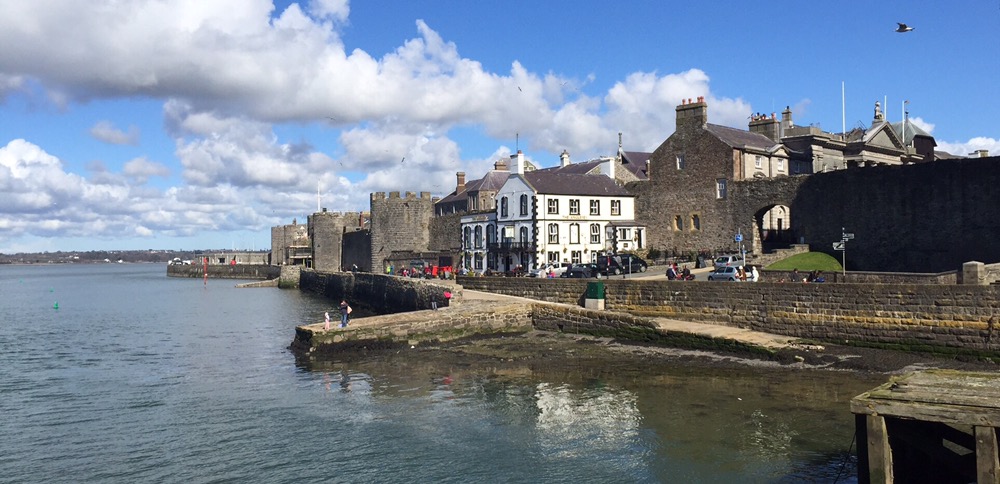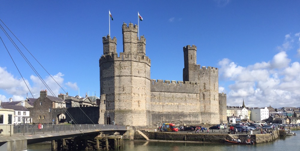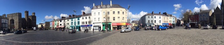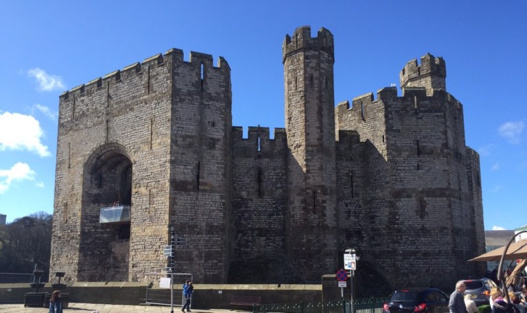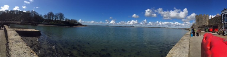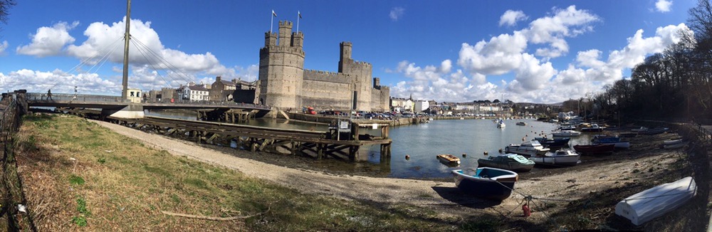 Schaue in ein paar Einkaufs- und Fussgängerpassagen rein, viel Volk aber nicht viel Sehenswertes. Laufe um die Festung bzw Burg herum zur Mündung des Afon Seiont Flusses ins Meer.
