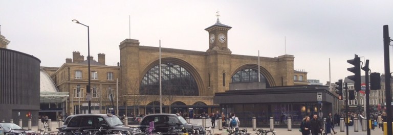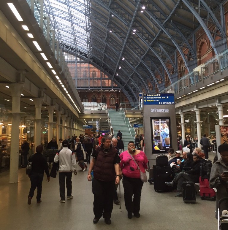 Transfer zu Fuss zum ungefähr 500 Meter entfernten Bahnhof St. Pancras, dem neuen Abfahrtsort für Chunnelzüge und nach Südwesten. Bis Dato bin ich immer von der Waterloostation abgefahren bzw angekommen. Fussmarsch mit Hunderten anderen Reisenden durch die Stadt. Schiesse ein paar Fotos, bevor ich um 16.20 den Pancrasbahnhof erreichen. Die alte Bahnhofshalle ist jetzt ein Einkaufszentrum und Flaniermeile. Suche das richtige Gleis und laufe sicher 2 Mal im Kreis herum, bevor ich 3 Minuten vor Zugsabfahrt endlich das richtige Perron finde und einsteige. Pünktliche Abfahrt, in einem grossen Bogen, nordöstlich um die Stadt herum,