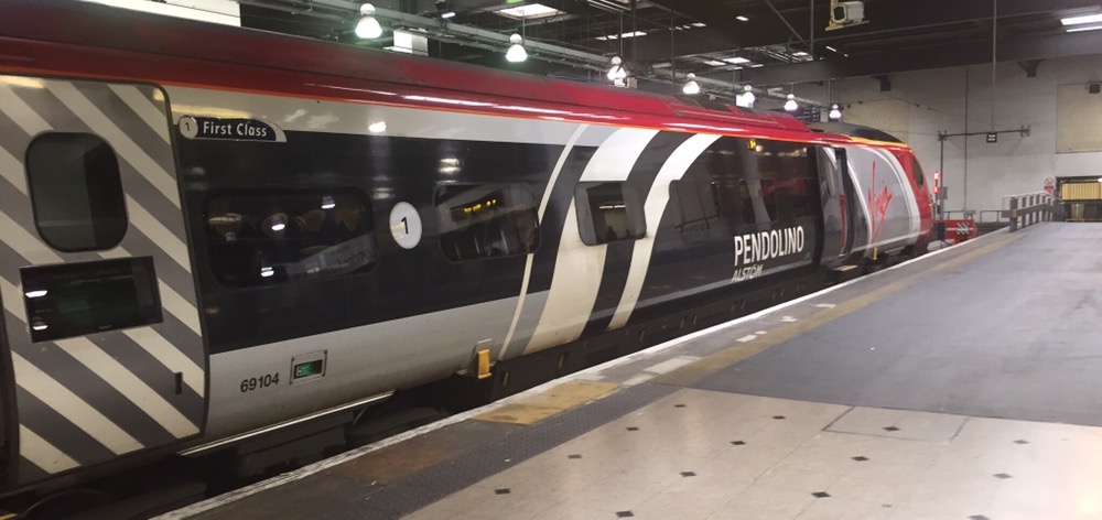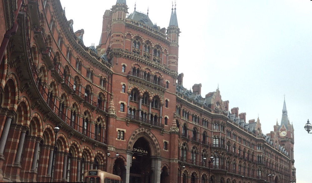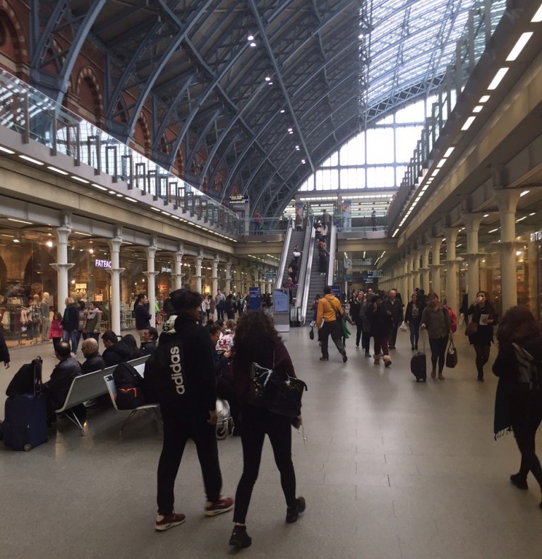 Transfer zu Fuss zum ungefähr 500 Meter entfernten Bahnhof St. Pancras, dem neuen Abfahrtsort für Chunnelzüge und nach Südwesten. Bis Dato bin ich immer von der Waterloostation abgefahren bzw angekommen. Fussmarsch mit Hunderten anderen Reisenden durch die Stadt. Schiesse ein paar Fotos, bevor ich um 16.20 den Pancrasbahnhof erreichen. Die alte Bahnhofshalle ist jetzt ein Einkaufszentrum und Flaniermeile. Suche das richtige Gleis und laufe sicher 2 Mal im Kreis herum, bevor ich 3 Minuten vor Zugsabfahrt endlich das richtige Perron finde und einsteige. Pünktliche Abfahrt, in einem grossen Bogen, nordöstlich um die Stadt herum,