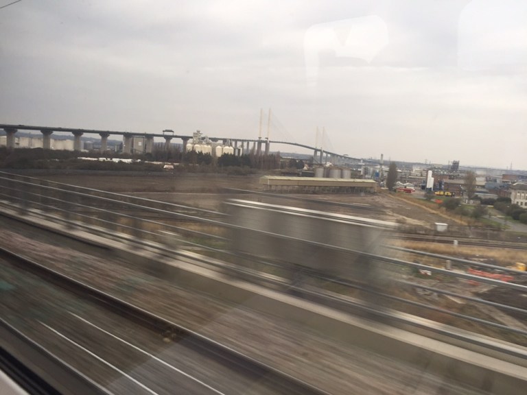 durch lange Tunnel, über hohe Brücken und schliesslich durch grünes Land rasen wir Folkestone entgegen. 17.29 Uhr erreichen wir pünktlich Folkestone.