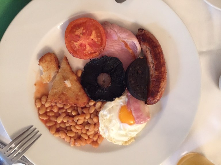 Die ganze Nacht hat es wiederum geschüttet und auch als ich gegen halb 8 mich erhebe, schüttet es trotz anderslautenden Wetterprognosen (bewölkt + 5%iges Niederschlagsrisiko) ohne Unterlass weiter. Frühstück, zum ersten Mal in diesen Ferien bestelle ich ein traditionelles englisches Frühstück.