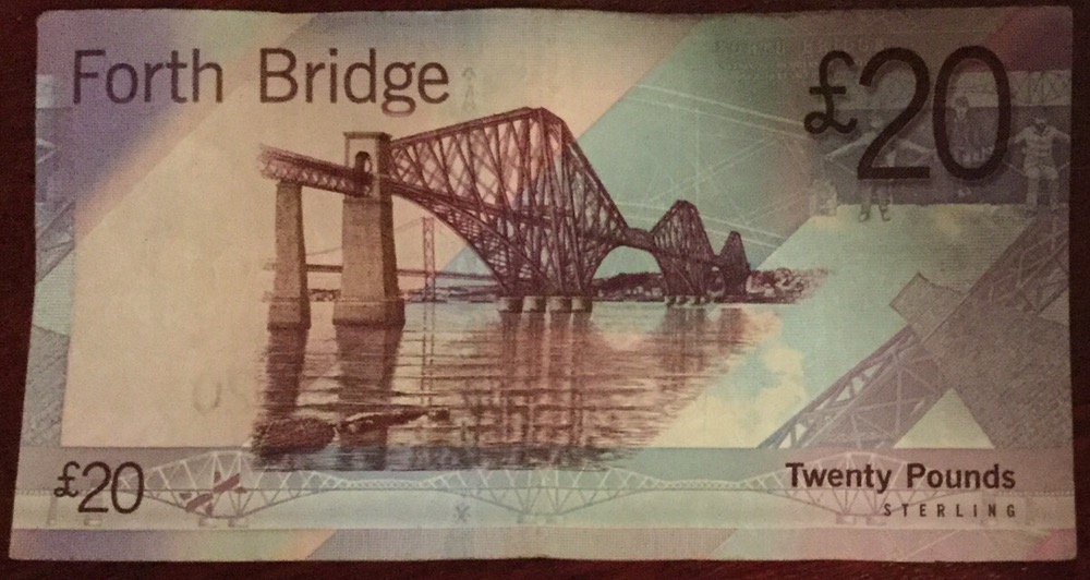 kleineren Wert als das britische Pfund (dies ist jetzt die 3. Auseinandersetzung um das schottische Pfund, das angeblich weniger Wert hat als das britische Pfund). Als Zusatz kommt jetzt noch das walisische Pfund ins Spiel! Ich brauche mehr als 5 Minuten um den Täxeler zu beruhigen und ihm zu zeigen, wo auf der schottischen Banknote (rechts unten, unter TWENTY POOUNDS) der Begriff STERLING steht. Die Bezeichnung lesen kann er nur dank eines starken Vergrösserungsglases. Jetzt steigt er aus, packt meinen Rucksack, schmeisst ihn wütig auf die Strasse und fordert mich auf auszusteigen. Nein zuerst will ich mein Rückgeld. Er droht mir heftigst, worauf ich ihn auffordere die Taxiuhr wieder laufen zu lassen und der Polizei zu telefonieren. Endlich erhalte ich zumindest 7 Pfund Sterling retour, mit der nochmaligen Behauptung die abgebildete Forthbrücke stehe in Wales, auf dem Weg nach Holyhead! Ufffff, soviel Altersdummheit und Blindheit tun weh!!!