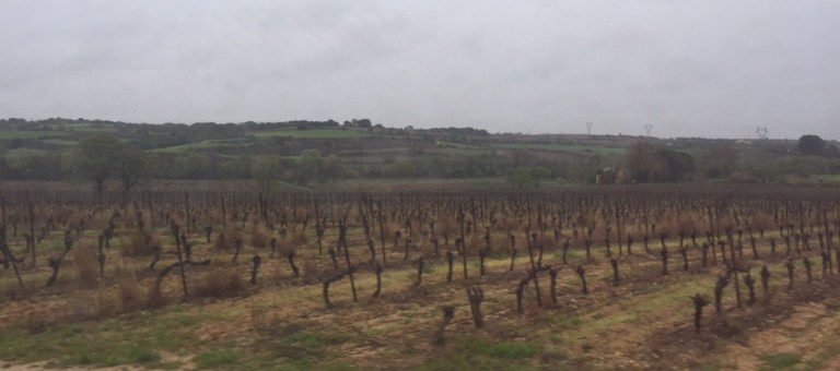 Leider ist das Wetter miserabel, die Wolken und Nebel hängen tief. Bereits kurz hinter Beziers gehts bergan, zuerst durch Weinberge,