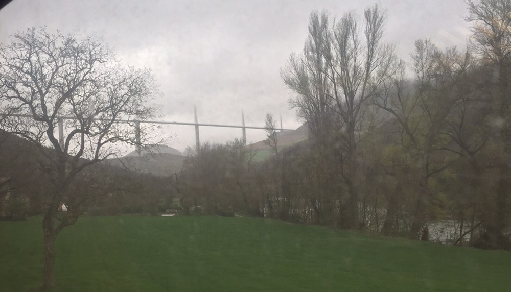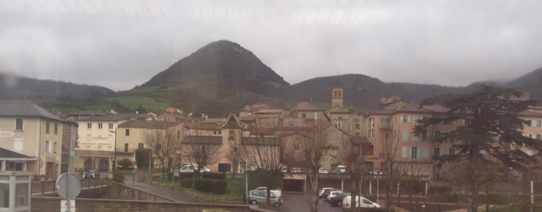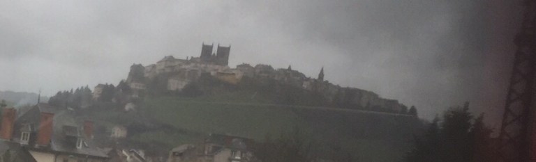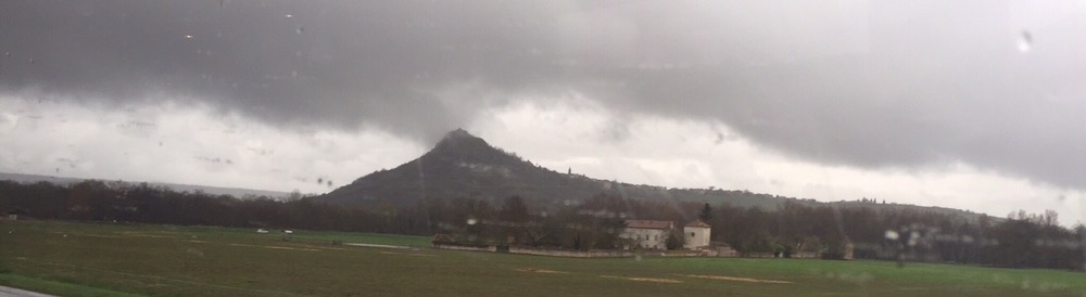 die Autobahnbrücke in den Wolken (https://de.m.wikipedia.org/wiki/Viaduc_de_Millau), 2460 Meter lang mit einem Pfeiler der fast 350 Meter misst. Ab der Gegend von Sévérac-le-Château sind immer häufiger pittoreske, ineinander verschachtelte Bergdörfer mit Kirchen, Burgen und Schlössern zu sehen. Fast auf der höchsten Höhe der heutigen Reise halten wir für 20 Sekunden in Aumont-Aubrac (https://de.m.wikipedia.org/wiki/Aumont-Aubrac), 1041 Meter über Meer gelegen, dem Ursprungsort der Aubrac Rindviecher (http://les.cevennes.free.fr/fr/aubrac.htm). Schon vor dem Bahnhof habe ich auf einer Wiese zwei grosse Herden dieser ursprünglich Rasse gesehen. Diese kraftvollen, urigen Tiere können übrigens auch auf dem Hof der Familie meiner Kleinkusine Katharina und Martin Meyer-Reusser im Hof Wolfsgruben in Schlattingen besichtigt werden, wo auch direkt Fleisch verkauft wird (http://hof-wolfsgruben.ch).