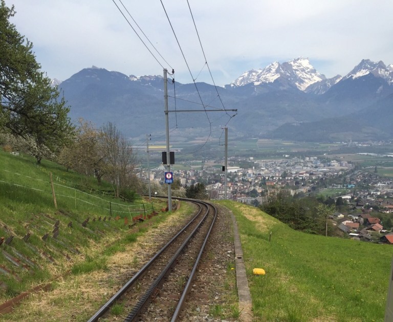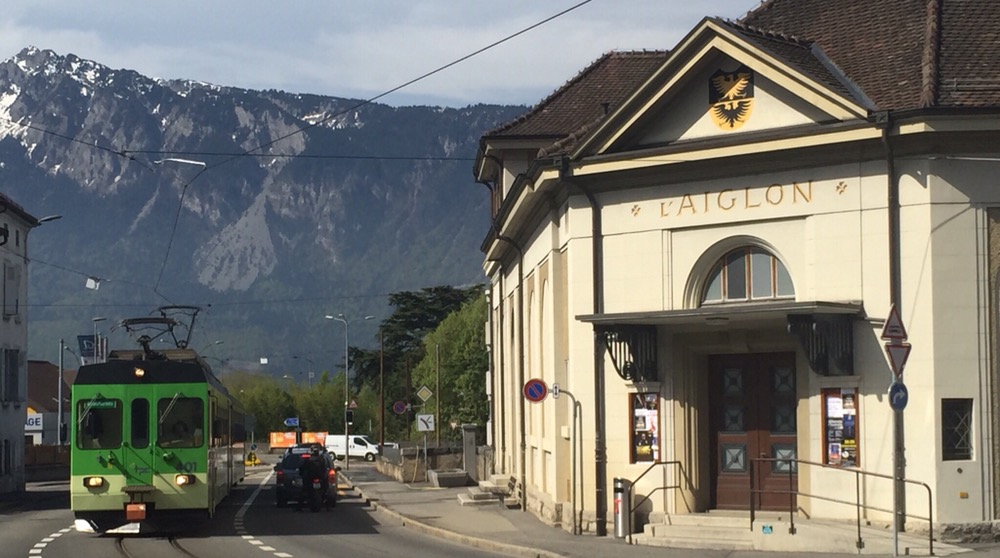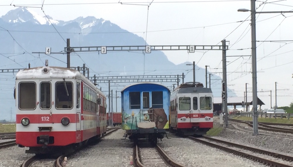 Wir wollen einen Zug überspringen und einen weiteren Stadtrundgang zu machen, um hoffentlich in einem alten, rot-weissen Triebwagen nach Aigle weiterzufahren. Gemäss erhaltener Auskunft verkehren die alten, ursprünglichen Züge aber nur noch am Vormittag, in gewissen Verstärkungszügen. Also fahren wir sofort weiter und planen anstattdessen noch zum Depot der Bahn zu laufen. Wir fragen den Triebfahrzeugführer nach der Haltestelle mit dem kürzesten Fussweg dahin. Ein paar Stationen später kommt der gute Mann zu uns gelaufen, er hat mit der Betriebsleitung gesprochen. Der Zug hält extra für uns an der Depothaltestelle „En Châlex“. Ein toller Service, Danke!
