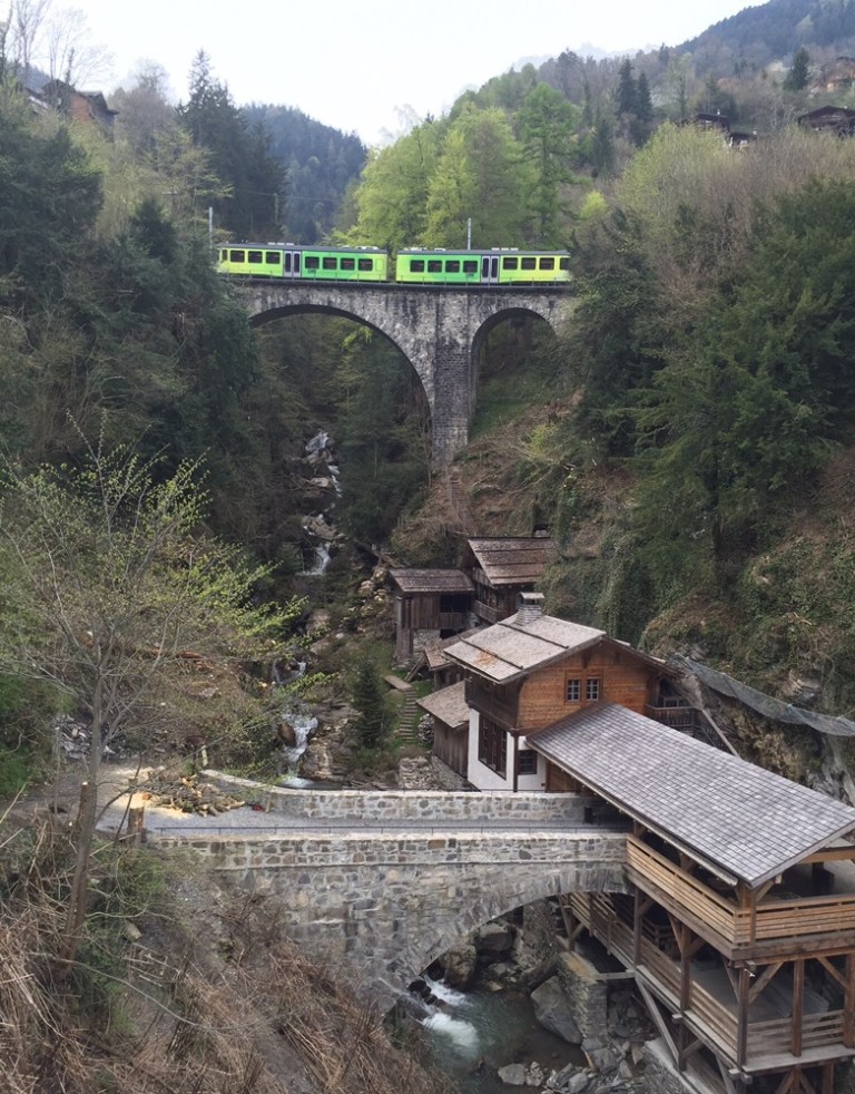 sowie den Bahnhofplatz und die nähere Umgebung ein erstes Mal kurz zu erkunden, bevor unser Zug nach Champéry (http://www.champery.ch) weiter fährt. In Fahrtrichtung links sitzend, so dass wir den Talblick geniessen können,
