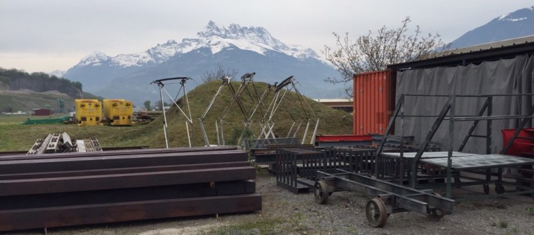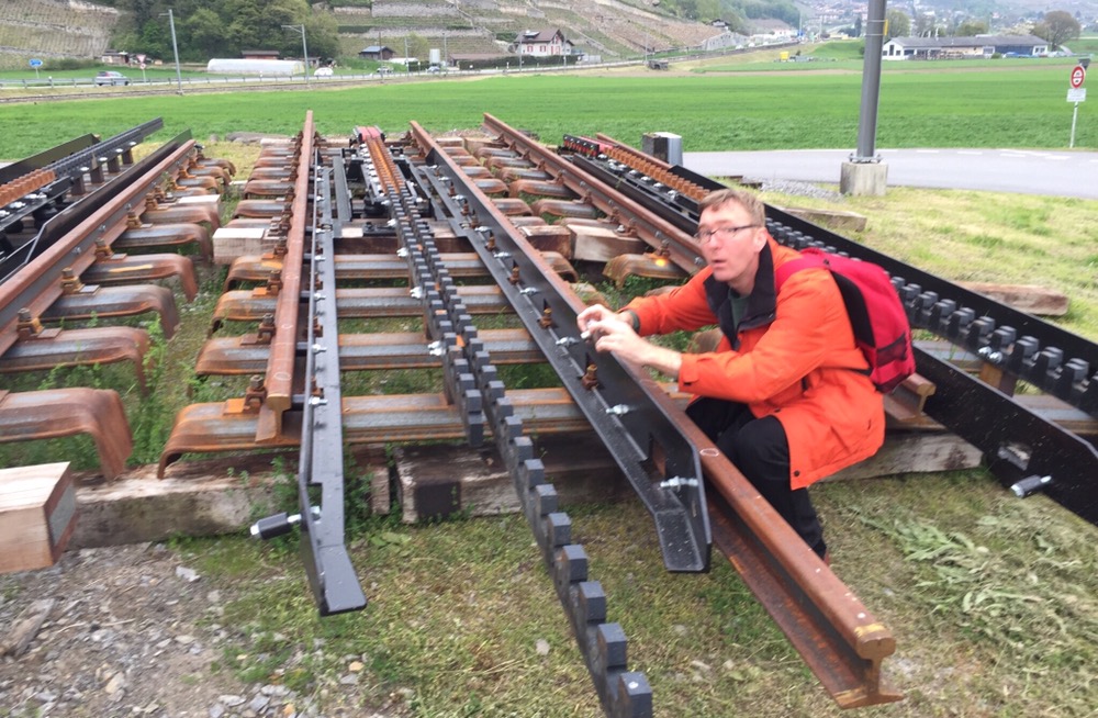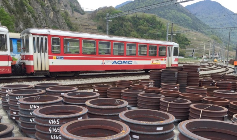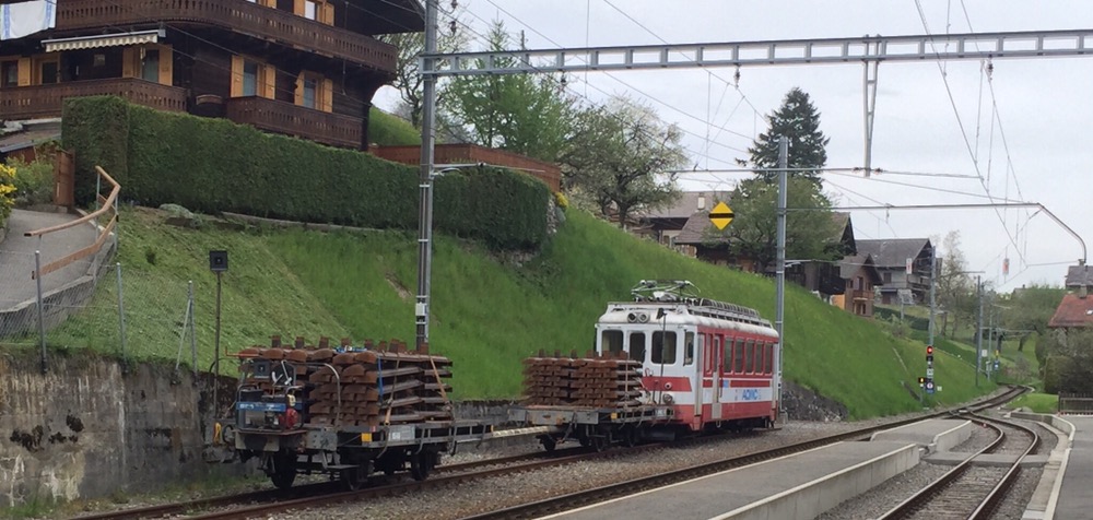 steil den Berg rauf nach Champéry. Bei allen Zahnstanngenabschnitten sind die neuen Schwellen, Zahnstangen und Schienen für die, in der kommenden Wochen startenden Bauarbeiten bereits abgeladen worden.