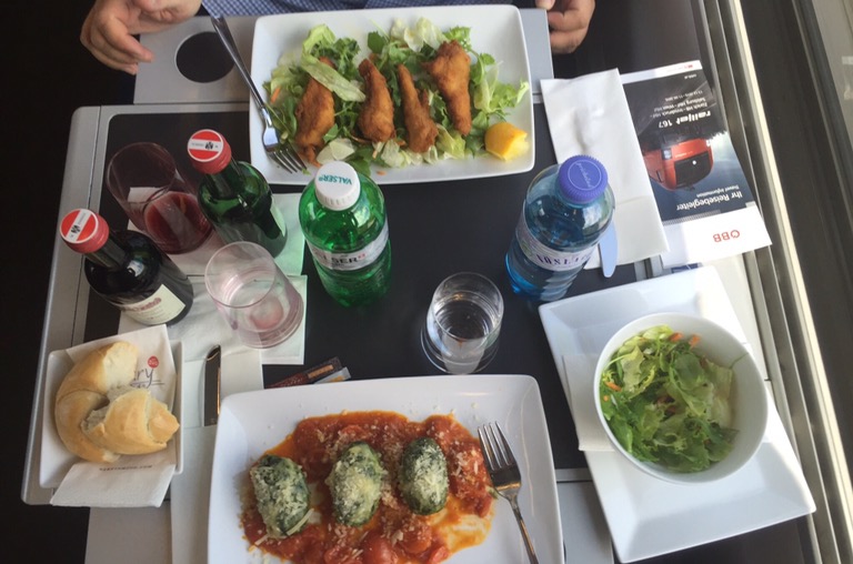 12.41 ab Zürich HB im Railjet Richtung Wien. Bedingt durch den unterschiedlichen Buchungszeitraum und die nicht immer gleich definierten Platzwünsche, sitzen wir 4 im Zug nach Innsbruck in drei unterschiedlichen 1. Klassewagen, schade. Immerhin sitzen Stufi und ich uns gegenüber.