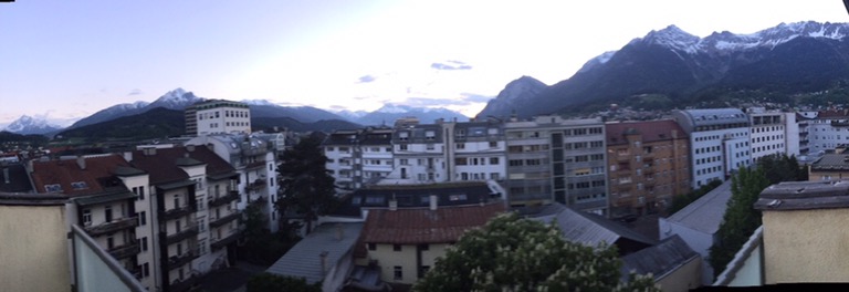 Nach dem Umzug beschließe ich auf das Abendessen zu verzichten und anstattdessen die Hotelsauna zu besuchen. Bin alleine da, kann schwitzen, ausspannen, die Aussicht auf die Bergwelt rund um Innsbruck geniessen und Tagebuchnotizen schreiben.