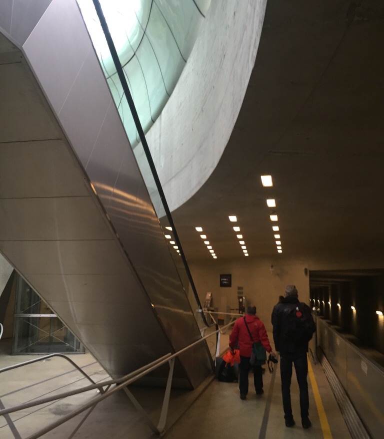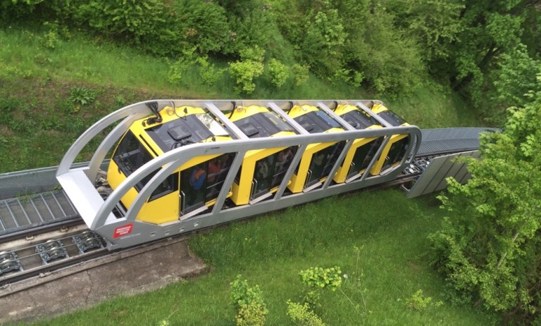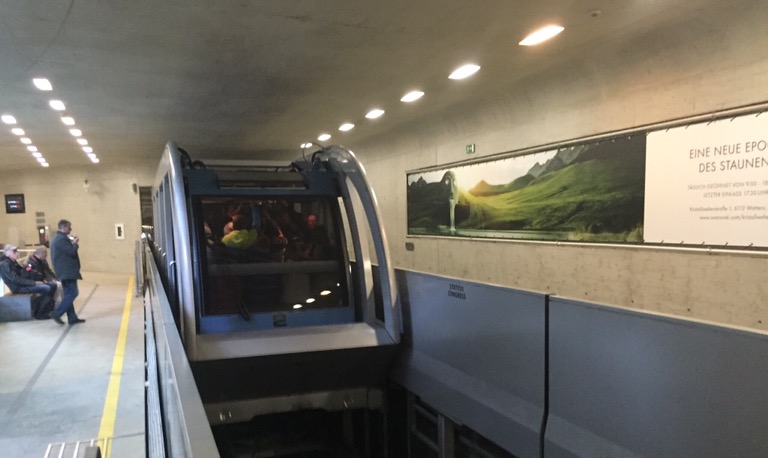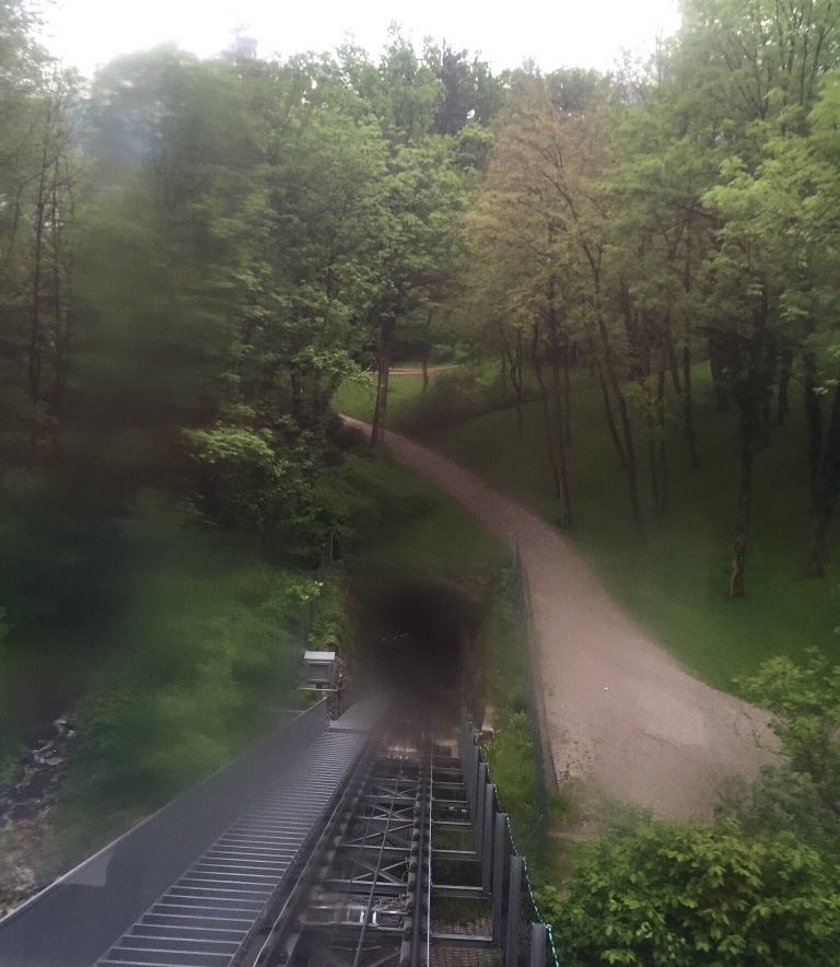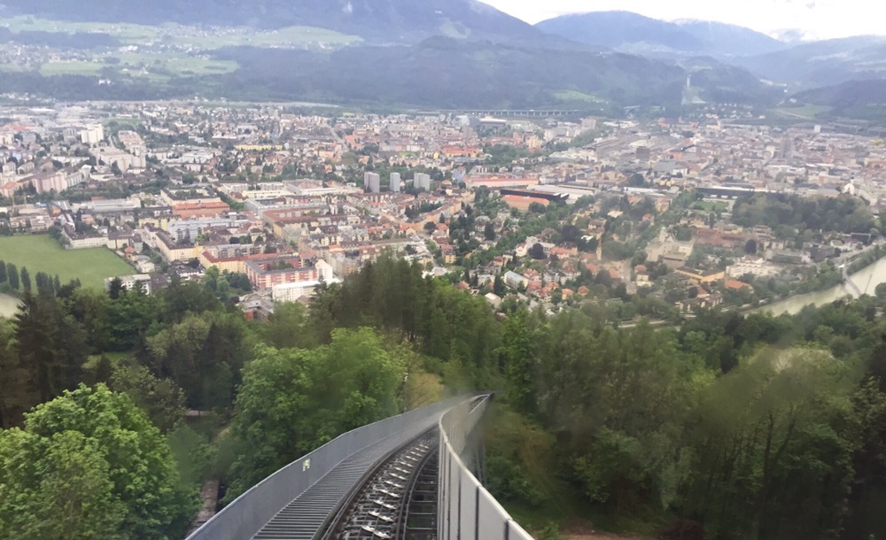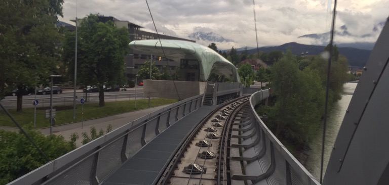 Anschliessend fahren wir mit der Hungerburgbahn (http://www.nordkette.com/cable-railways/history/the-hungerburg-funicular.html), einer modernen Standseilbahn, mit sich der Neigung anpassender Kabinenlage, durch Tunnel und über Brücken, mit ständig wechselnden Gradienten zwischen -30% und +46% zum Stadtteil Hungerburg hinauf.