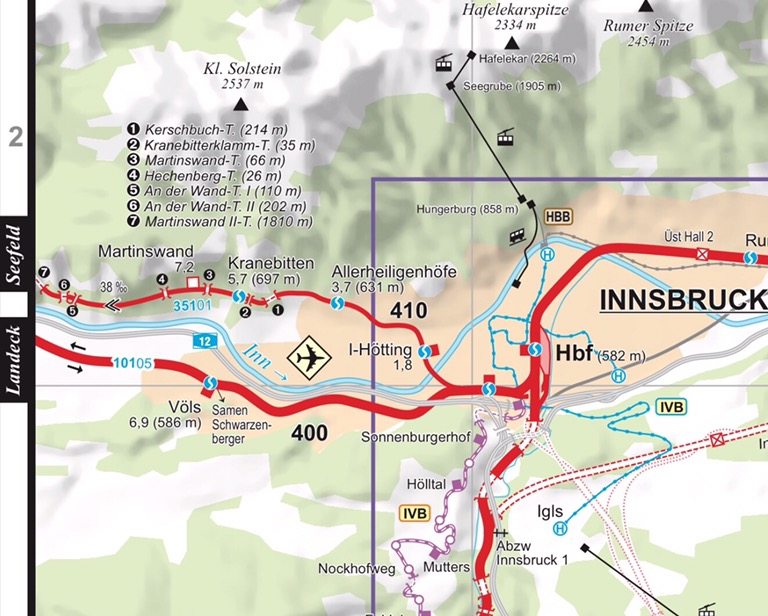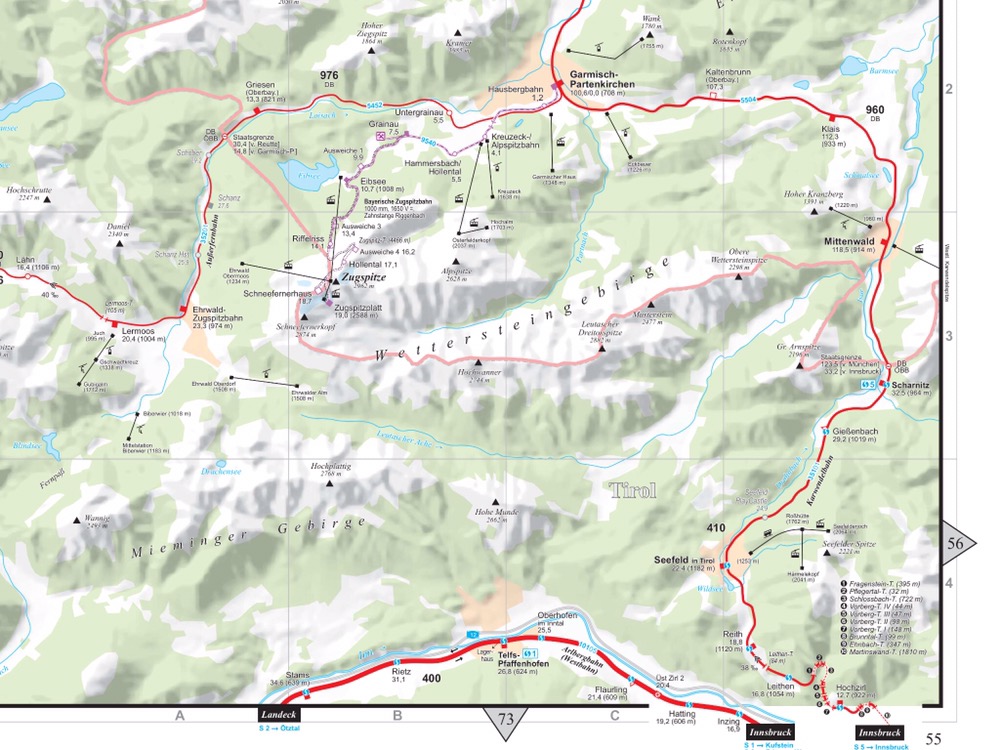 Die Karwendelbahn besticht durch kühne Streckenführung. Von Hötting einem kleinen Vorortsbahnhof von Innsbruck auf 580 MüM steigt die Strecke steil an, um am Seefelder Sattel auf 1’184 Meter über Meer ihren Scheitelpunkt zu erreichen. Auf der Distanz von 19,2 km muss dieser Höhenunterschied erreicht werden. Der kleinste Kurvenradius der