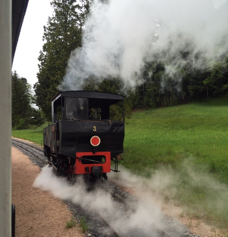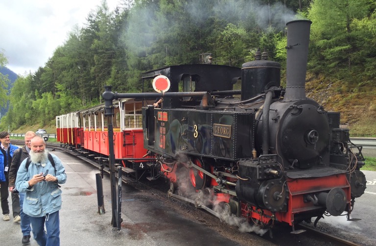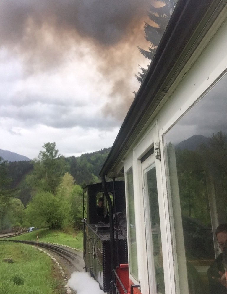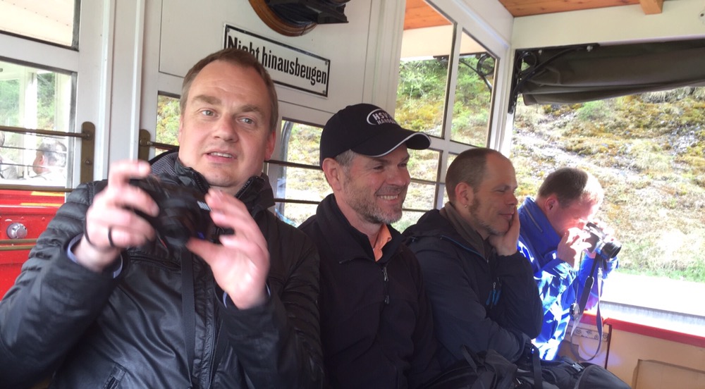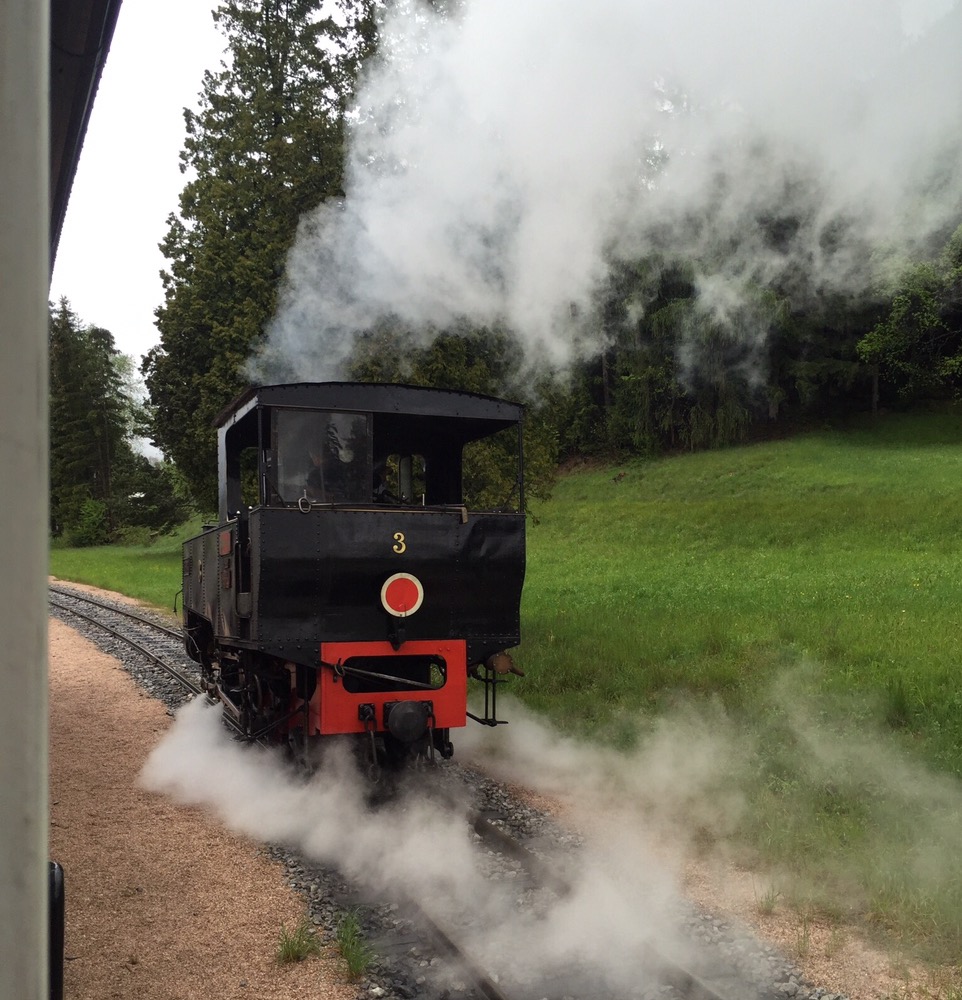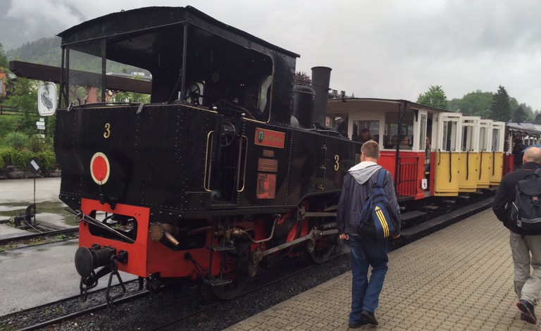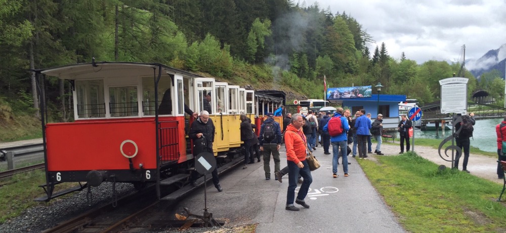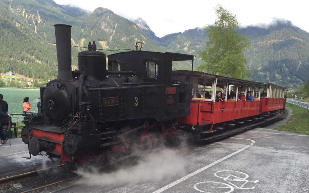 Die ausschliesslich dampfbetriebene Bergbahn mit Loks und Vorstellwagen, die allesamt aus der Anfangszeit stammen, fährt uns auf einer 1000 mm Spur, mit Zahnrad des Systems Riggenbach, gute 440 Meter hoch zum Bahnhof Eben. Nach Umstellung der Lok an die Spitze des Zuges, führt die Bahn auf einer Adhäsionsstrecke wieder runter zum 40 tiefer gelegenen Achensee.