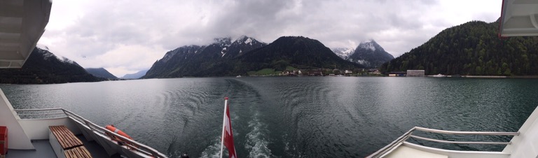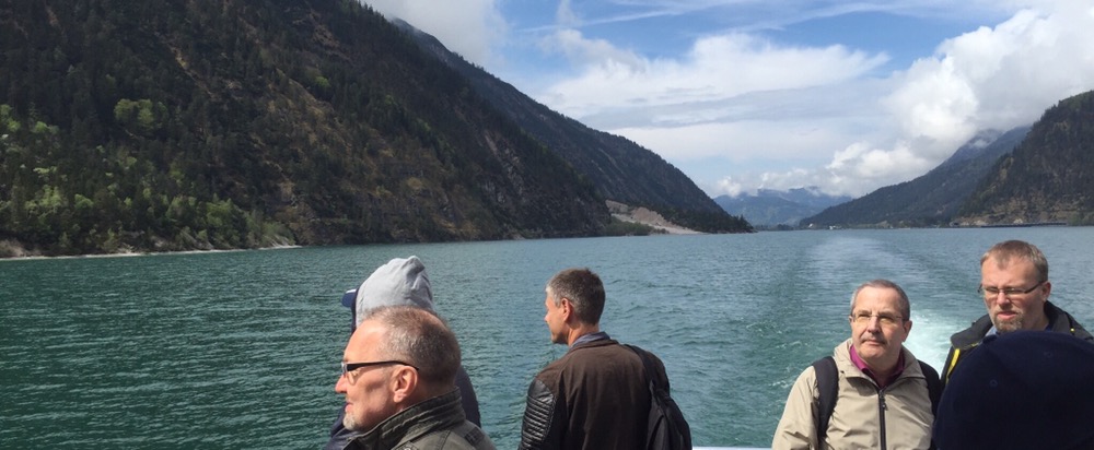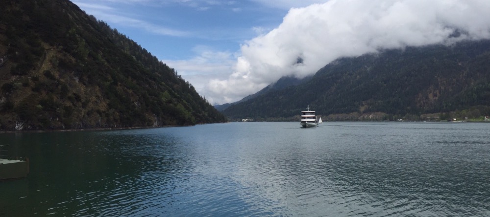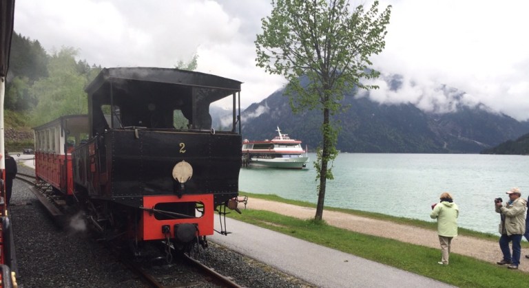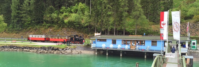 Bereits um 15:10 Uhr fährt unser Schiff wieder zurück von der Gaisalm zur Seespitze, von wo unser Dampfzug pünktlich um 16 Uhr wiederum nach Jenbach zurückfährt.