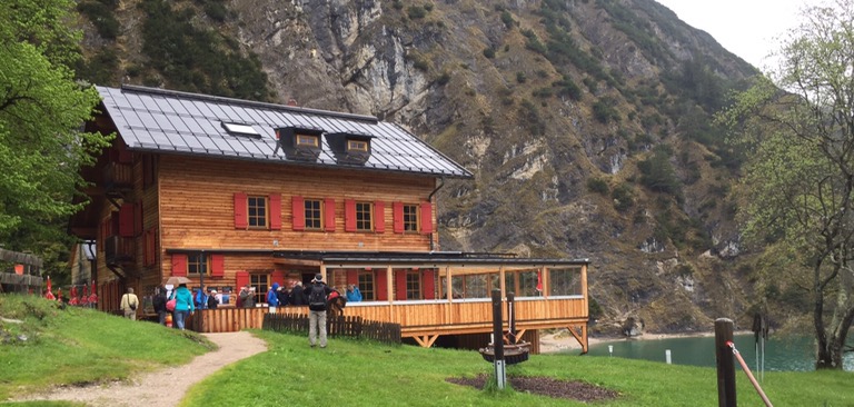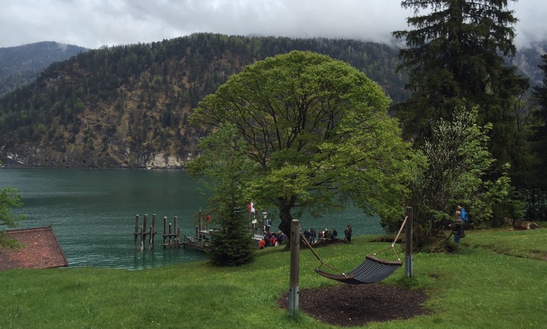Die Alm bzw Alp ist nur zu Fuß oder mit dem Schiff erreichbar, also der beste Platz um die Seele baumeln zu lassen. Wir wollen aber nicht nur unsere Seele füttern, sondern irgendwo auch unseren Magen. Je nach Lust und Laune könnten wir entlang dieses fjordähnlichen Sees auch wieder zur Seespitze zurückwandern. Angesichts des anhaltenden Nieselregens fällt es uns aber ich nicht schwer, den Gasthof hier zu besuchen. Auf der überdachten und windgeschützten Terrasse essen, trinken, geniessen, reden und lachen wir.