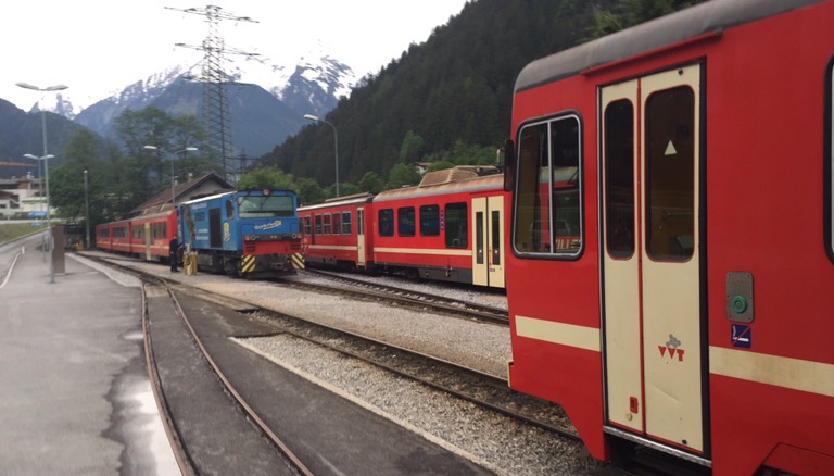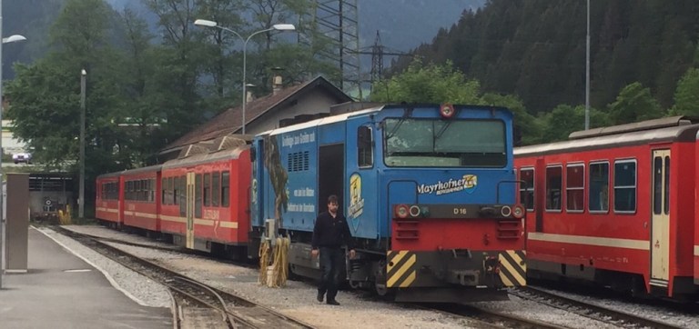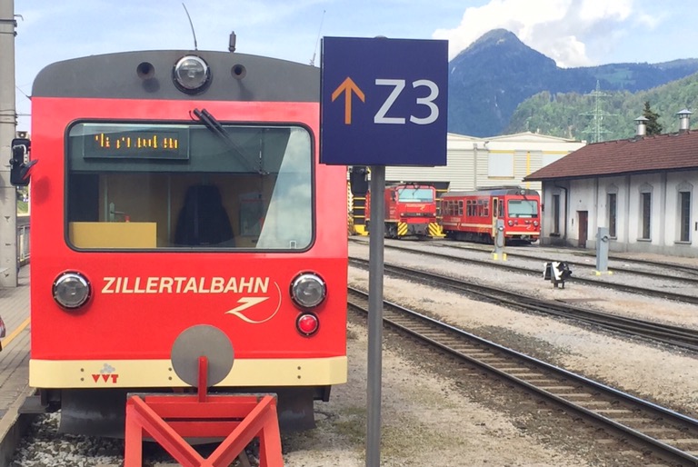 16:42 Uhr sind wir wieder unten im Tal, in Jenbach. Anstatt wie der grosse Rest der Gruppe direkt nach Innsbruck umzusteigen, beschliessen ein Dutzend von uns, noch der 3. Spurweite, der mit Dieselfahrzeugen betriebenen Zillertalbahn einen Besuch abzustatten und mit dem nächsten Zug nach Mayrhofen zu fahren.