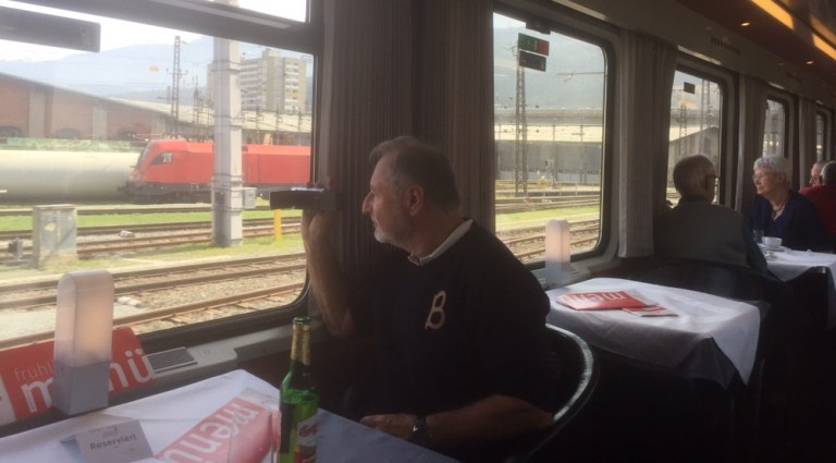 nach Lienz – Villach – Rosenbach und durchs Karawankengebirge nach Laibach hat wegen eines Notfalleinsatzes fast 90 Minuten Verspätung. Es bläst eine kalte Bise, also verweilen wir in der Bahnhofsgaststätte.