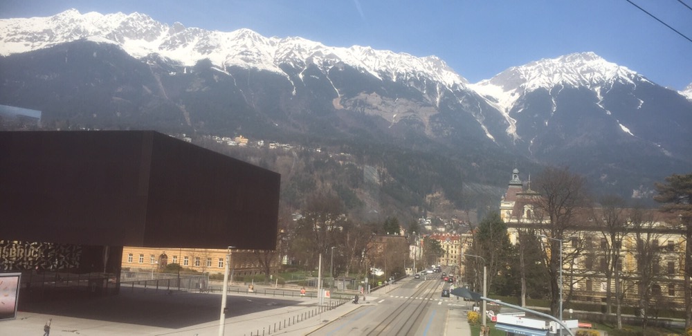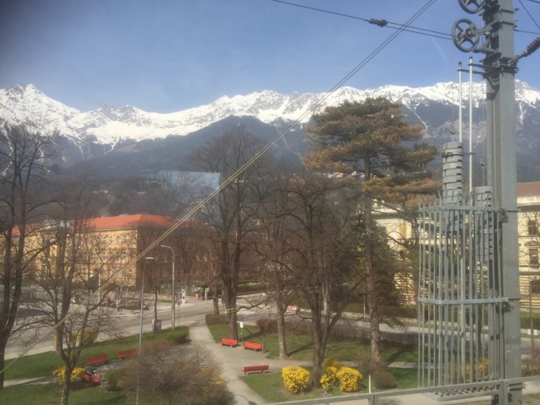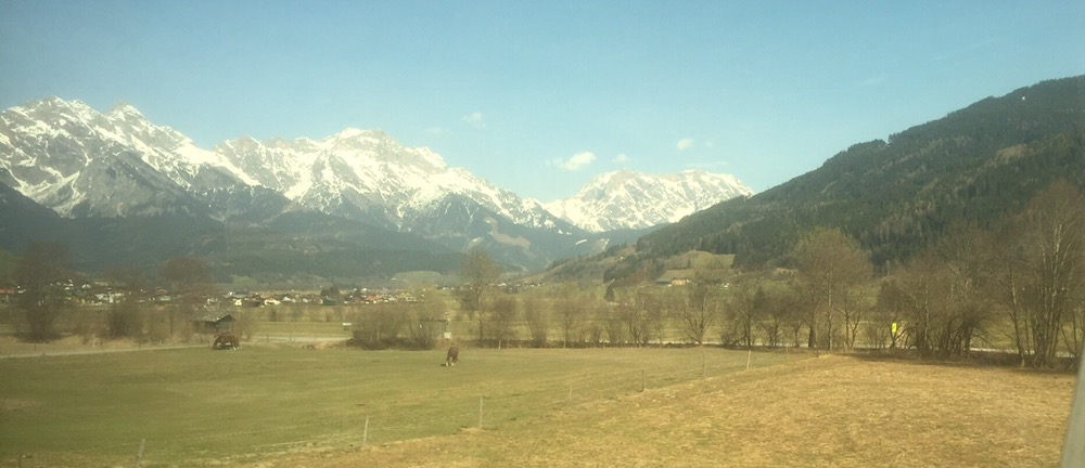 Mit ein paar Minuten Verspätung geht es los. Das Wetter wird immer besser, bald verschwinden letzte Nebelschwaden. Am Arlberg liegt noch beträchtlich Schnee, die Kunstschneeskipisten sind bevölkert.