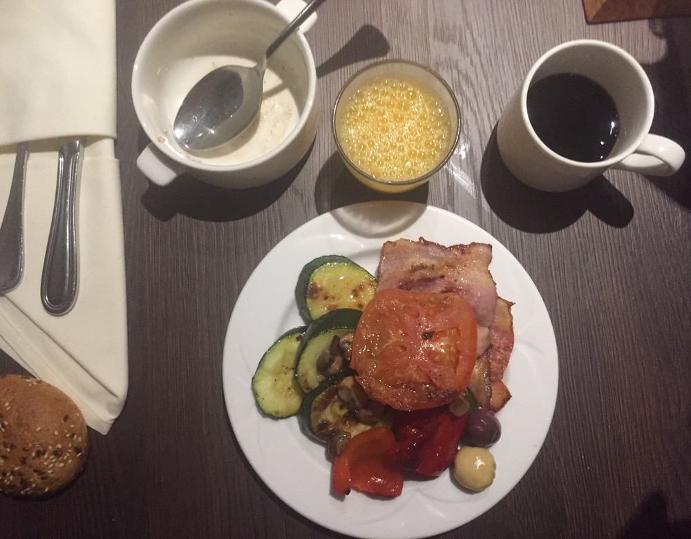 Uffuff, das Buffet lässt keinen Wunsch offen: Fleisch warm und kalt, ebenso Gemüse und Früchtekuchen, Milch, Käse und Eierspeisen. Ich geniess ein Müsli und einen grossen Teller gegrilltes Gemüse.
