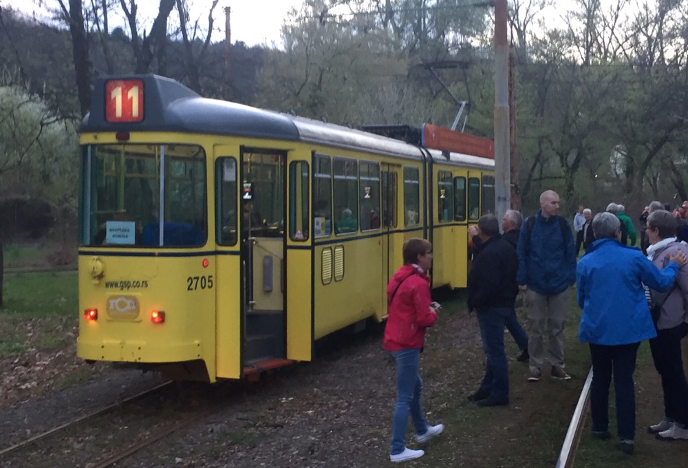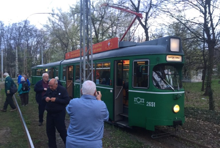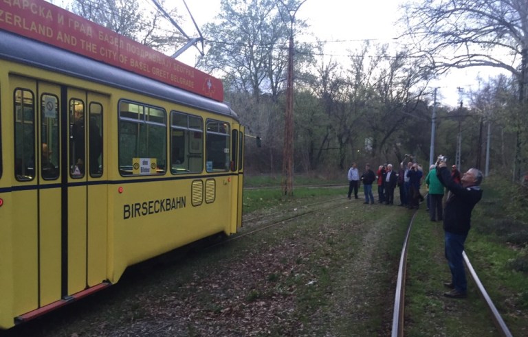 Auf dem Bahnhofplatz erwartet uns eine riesige Überraschung: Ein hellgelbes Tram der Baselländischen Birseckbahn sowie ein grünes Düwag-Drämmli ,inklusive 4-achs Anhängewagen der Basler Verkehrsbetriebe, toll.