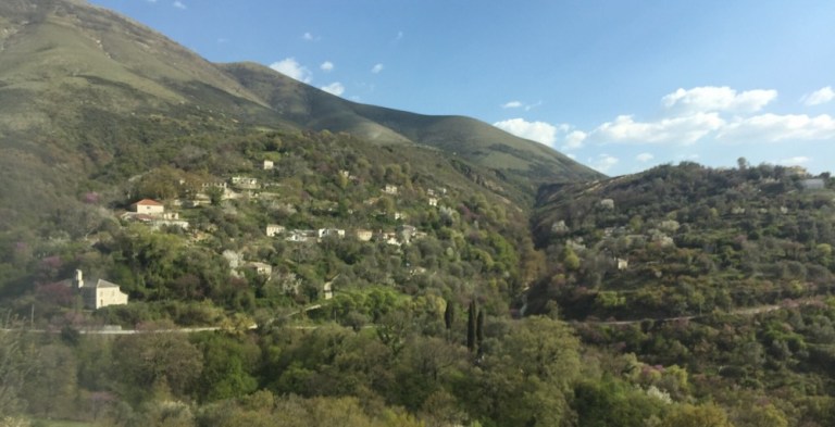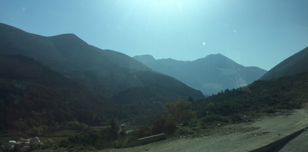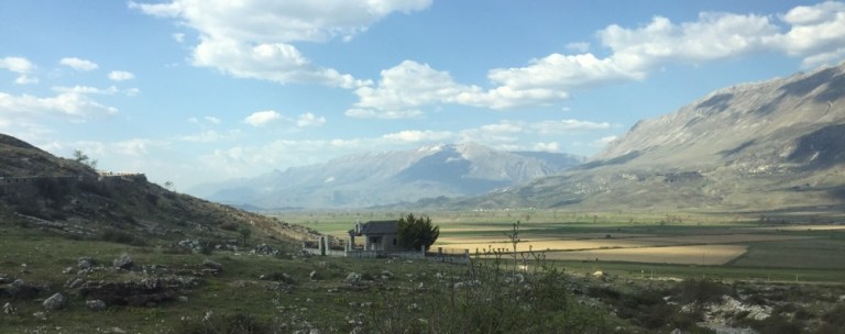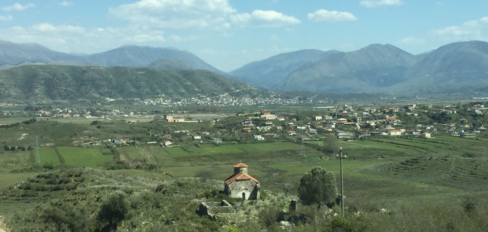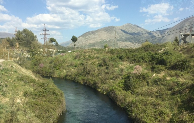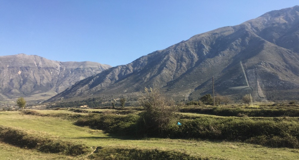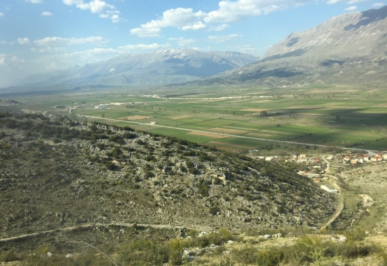 Der Fluss Drino/Drin (https://de.m.wikipedia.org/wiki/Drino) führt viel Wasser. Im Süden sind die Schneeberge des Pindargebirges(?) an der Grenze zu Griechenland zu sehen.