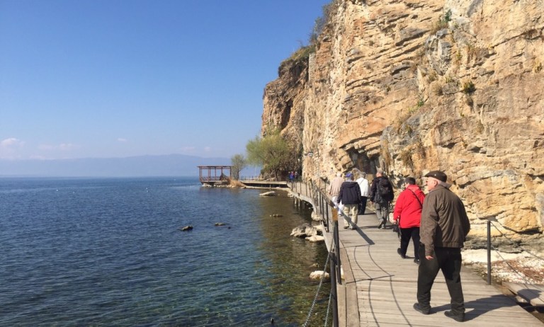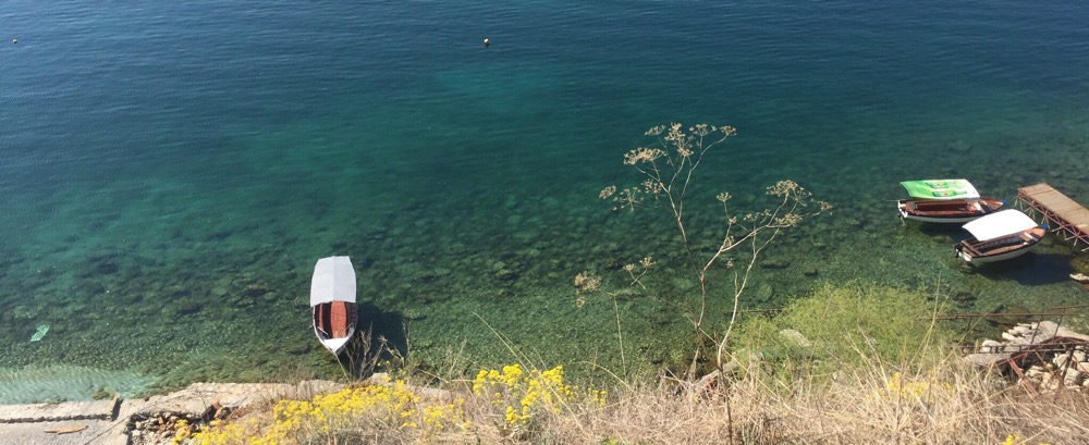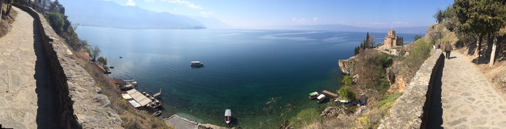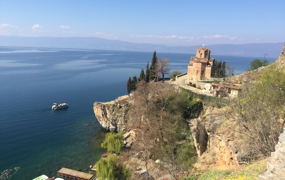 auf dem hölzigen Steg gen Norden, den Berg hoch, um den besten Blick auf die Kirche des Theologen Johannes zu erhaschen. Runter zur Kirche und rund herum.