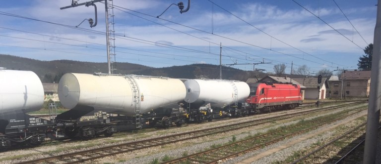 eine 4-achsige Ellok übernimmt unseren Zug zur Fahrt über die letzten hohen Gebirgszüge bis nach Rjieka.