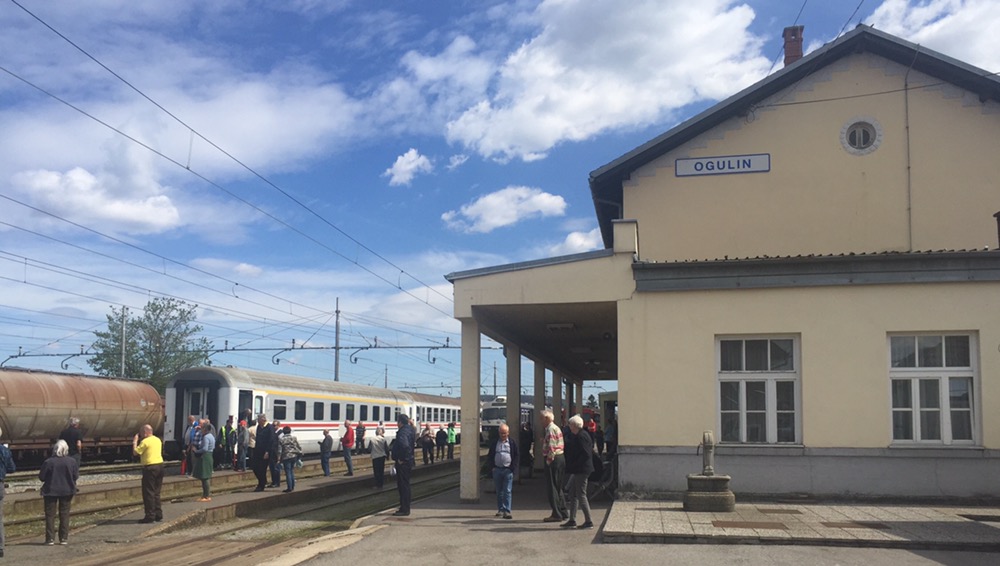 14.32 – 14.44, Ogulin, kurz vor dem Bahnhof ist die Strecke aus Zagreb eingemündet, die Diesellok wird abgehängt,