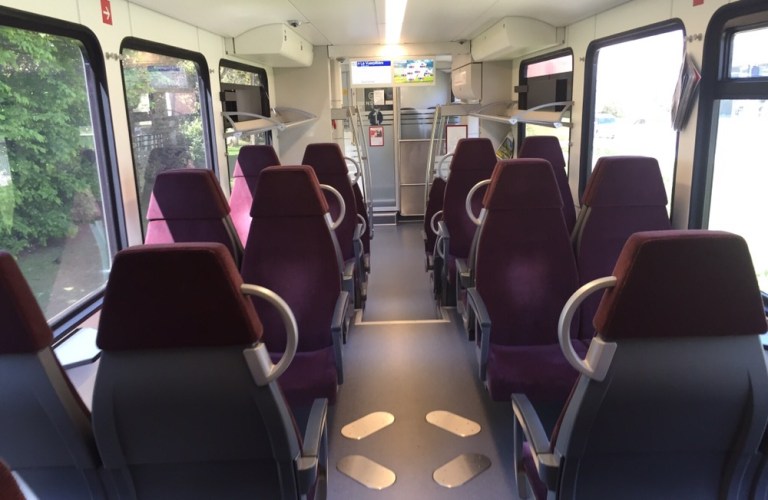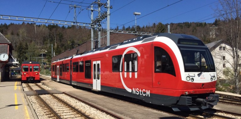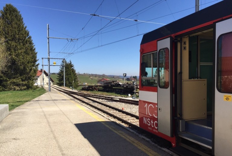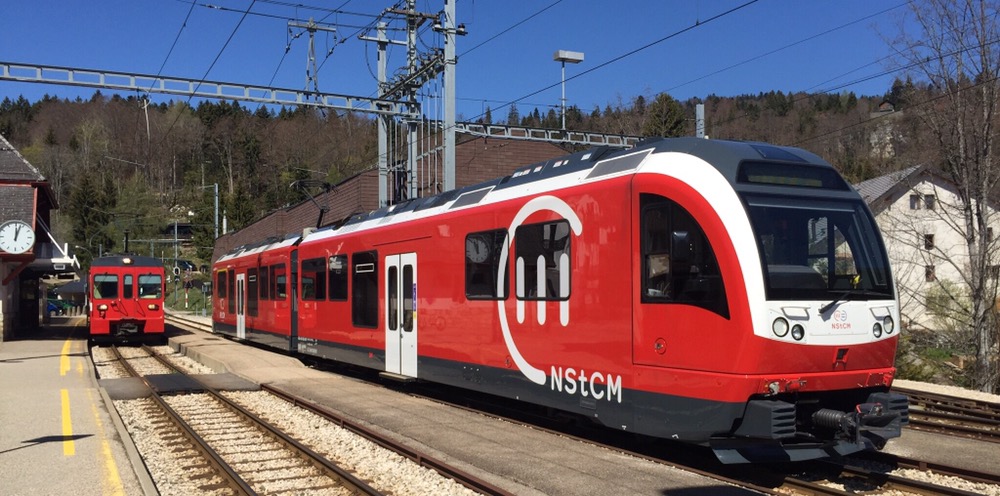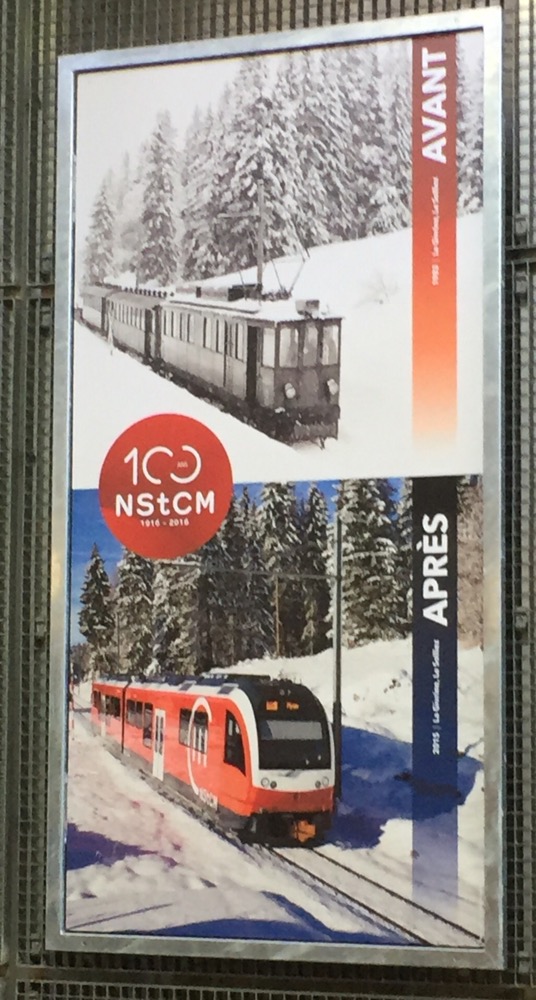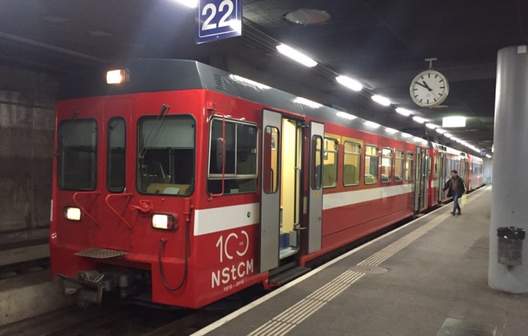 Bei Der Rückkehr nach Nyon steht auf dem Gleis gegenüber ein neuer Stadlerzug zur Abfahrt nach Genolier bereit. Also hopp, noch eine Fährt mit der NStCM, die ihren Endpunkt gemäss den Initialen, seit 1958 nicht mehr erreichen kann. Ich schaue mir den Zug gründlich an