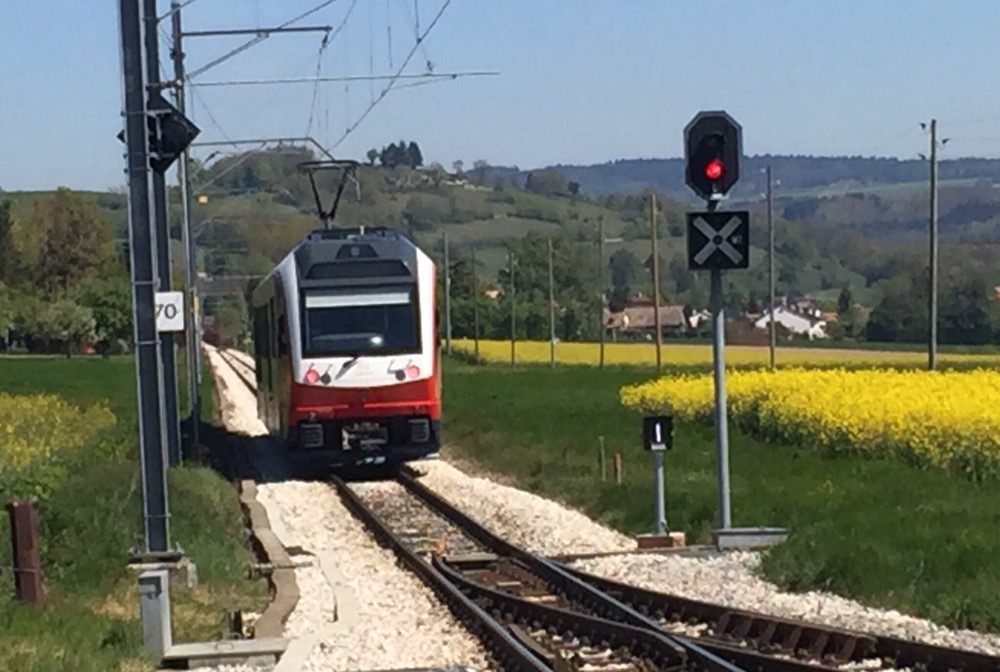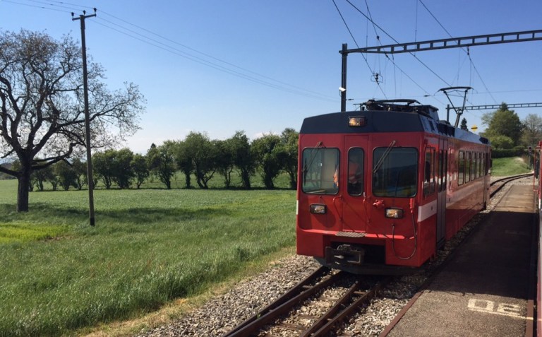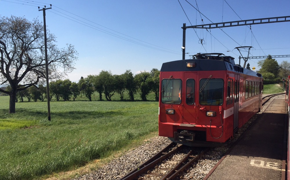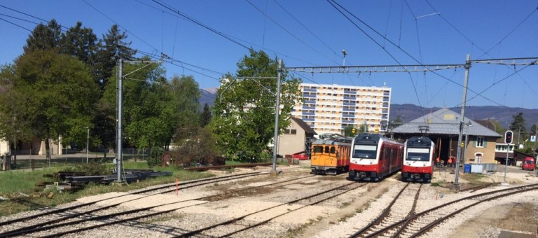 Lausanne, Nyon. Mit der fast komplett sanierten, einst bequemsten Schmalspurbahn (mit ausfahrbaren Ein-Ausstiegstreppen)
