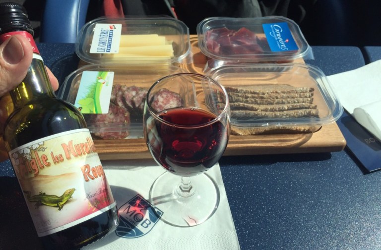 Da ich unterdessen doch recht hungrig bin, bestelle ich bei der kurz nach Abfahrt bereits vorbeikommenden Stewardess, ein Aperoplättli und einen Schluck roten Eidechslisaft, besser bekannt unter der Bezeichnung „Aigle les Murailles“ Rouge.