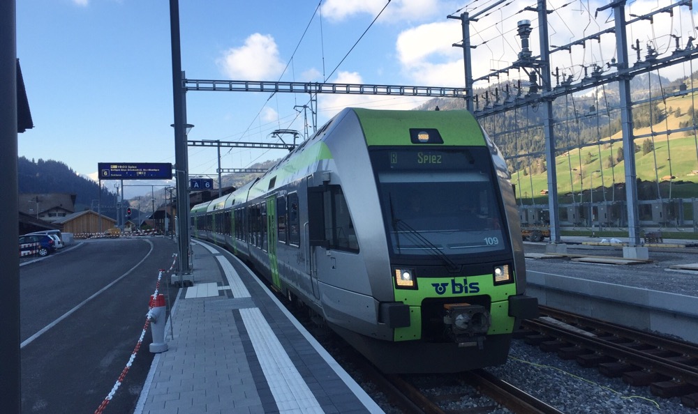 Das Dorf liegt schon im Schatten, der Bahnhof ist eine riesige Bauwüste, nur ein einziges 4-Schienengleis steht den BLS Zügen Richtungen Spiez zur Verfügung. Es stellt sich die Frage ob der Zug auf der Strasse fährt?!