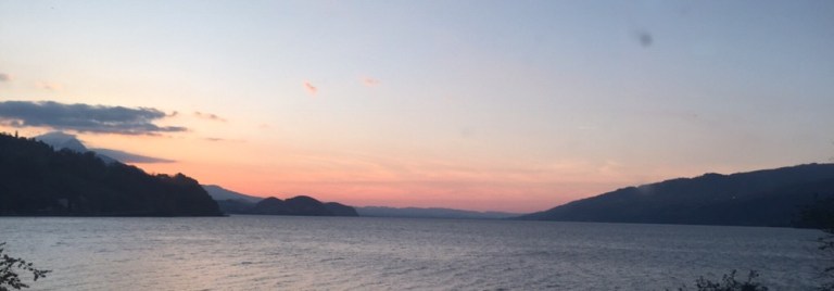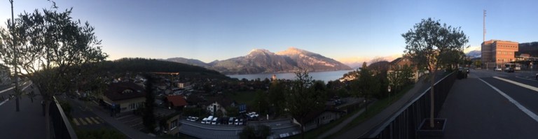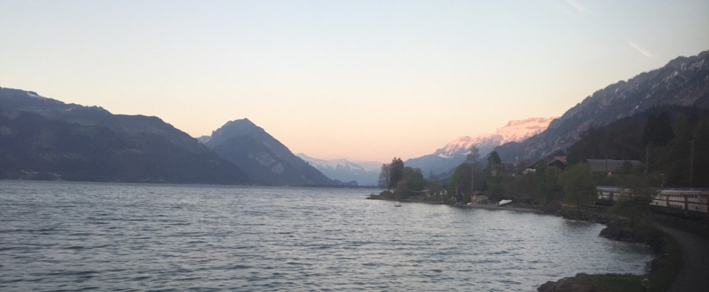 Letztes Tageslicht während der Reise entlang des Thunersees nach Interlaken Ost.