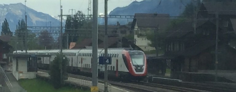 11.02 auf den Regio nach Interlaken. Unterdessen bläst ein veritabler Föhnsturm, das Thermometer zeigt 25 Grad Celsius (ob das wohl stimmen mag?) Auf jeden Fall muss ich den Pullover ausziehen, es ist T-Shirtwetter.