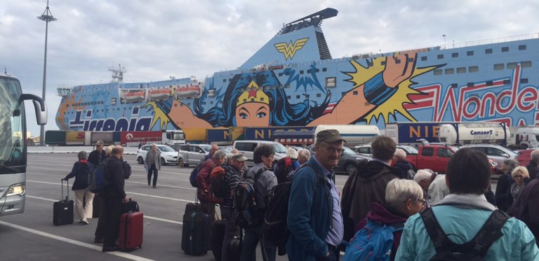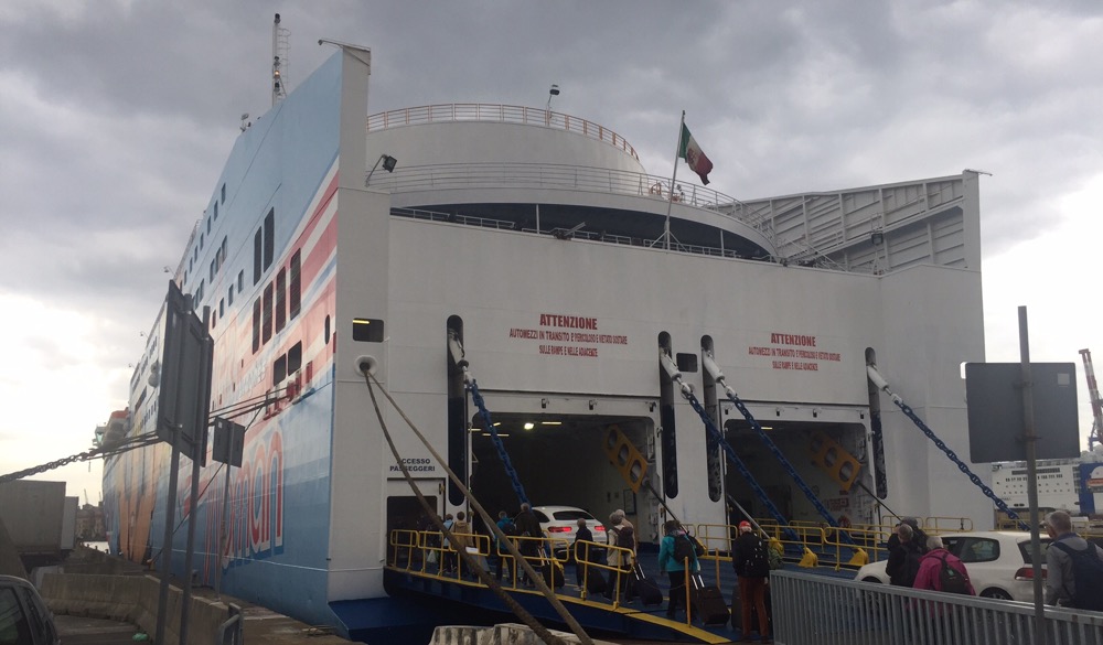 Gegen 18.30 erreichen wir den Fährhafen von Genua. Aussteigen und Auslad des Gepäck, warten in der Asphaltwüste vor der Fähre. Nachdem unsere Reiseleitung die Tickets organisiert hat, dürfen wir zwischen Autos und Lastwagen hindurch endlich einsteigen.