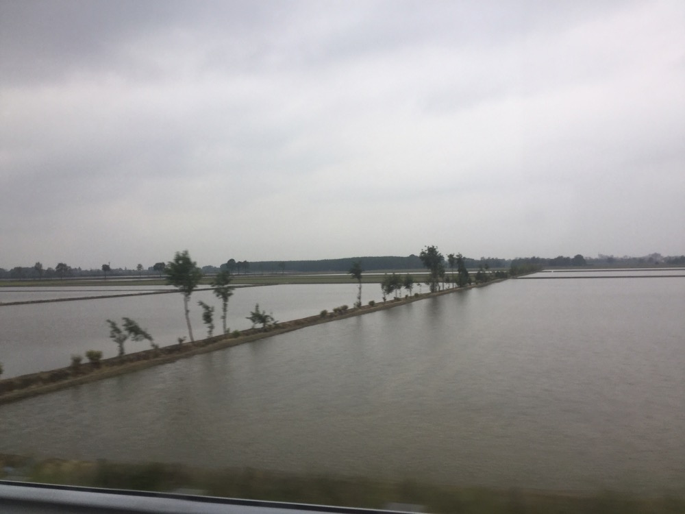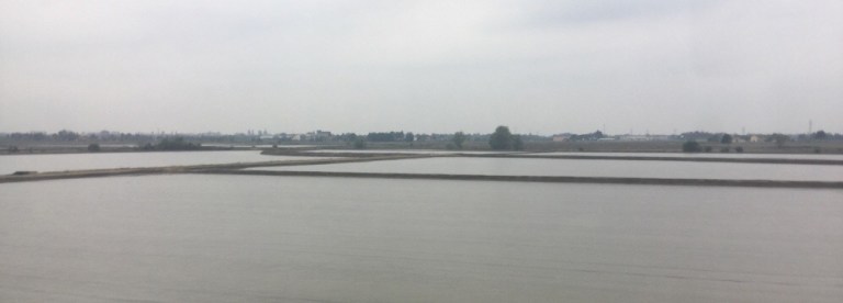 14.40 in einem Reisebus (m)unterwegs nach Genova. Bald lichten sich die Nebelwolken, der Regen wird spärlicher und hört bald ganz auf. Nach etwas über einer Stunde haben wir das flache Land erreicht. Links und rechts der Autobahn sind die ersten im knöcheltiefen Wasser daliegenden Reisfelder zu sehen.