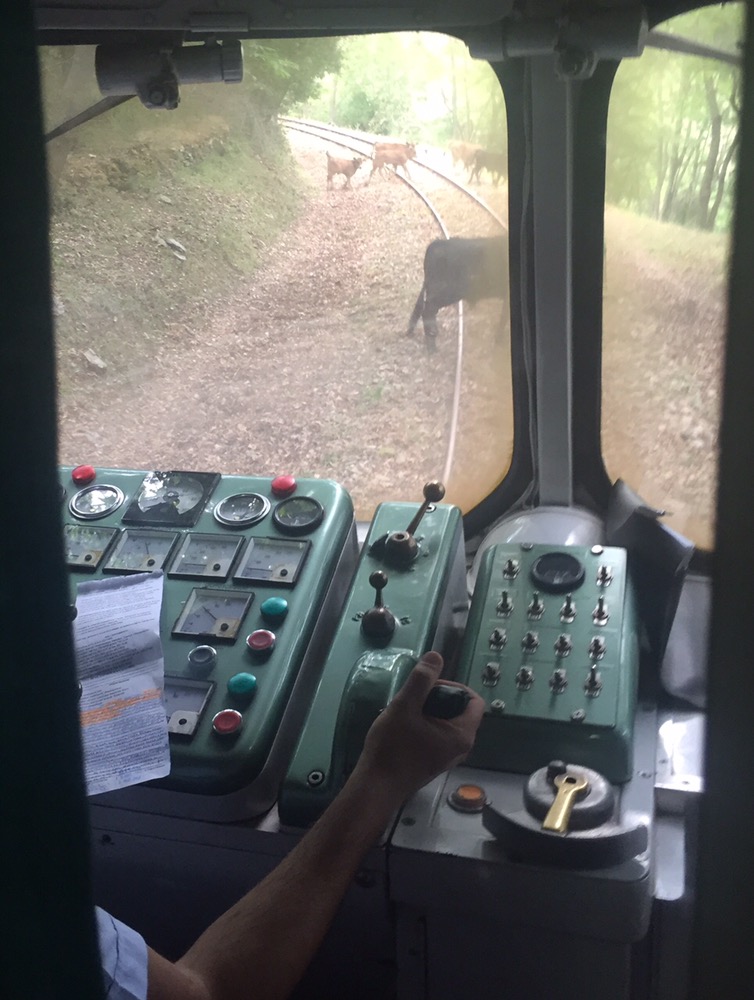 wohl einzigartig in Italien: Steil bergauf und ebenso bergab, über Pässe und durch Schluchten, Bogenbrücken, Viadukte, hohe Dämme. Steine auf den Schienen die einen kleineren Schaden verursachen, halbverwilderte Mutterkühe, die in Panik und verfolgt von ihren Kälber in Tunnel rennen und kilometerweit vor dem Zug hertraben, da es für sie keinen Fluchtweg abseits der Schienen zu geben scheint, Wildtiere. Fotohalte an Bahnhöfen und einfachen Betriebspunkten.